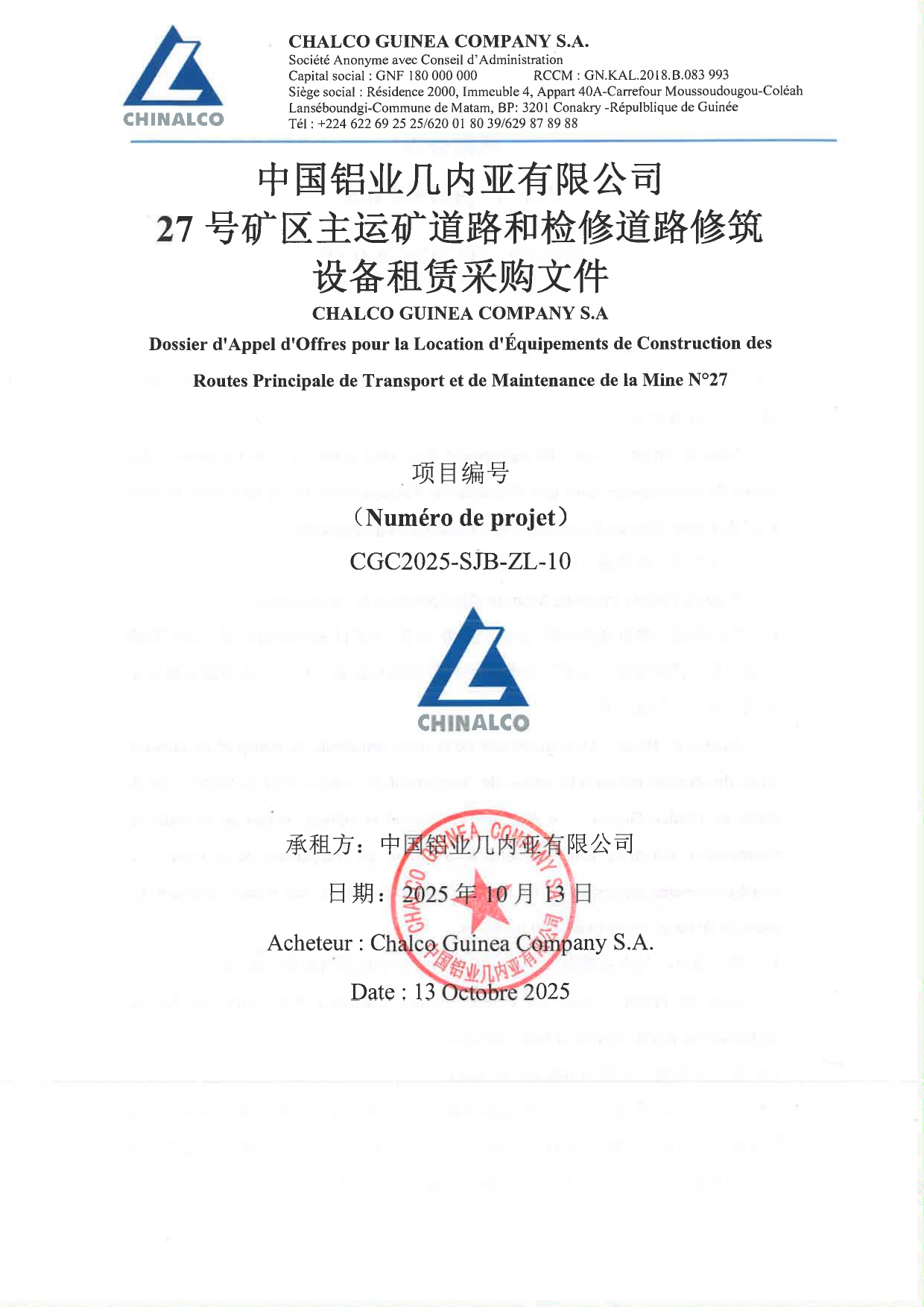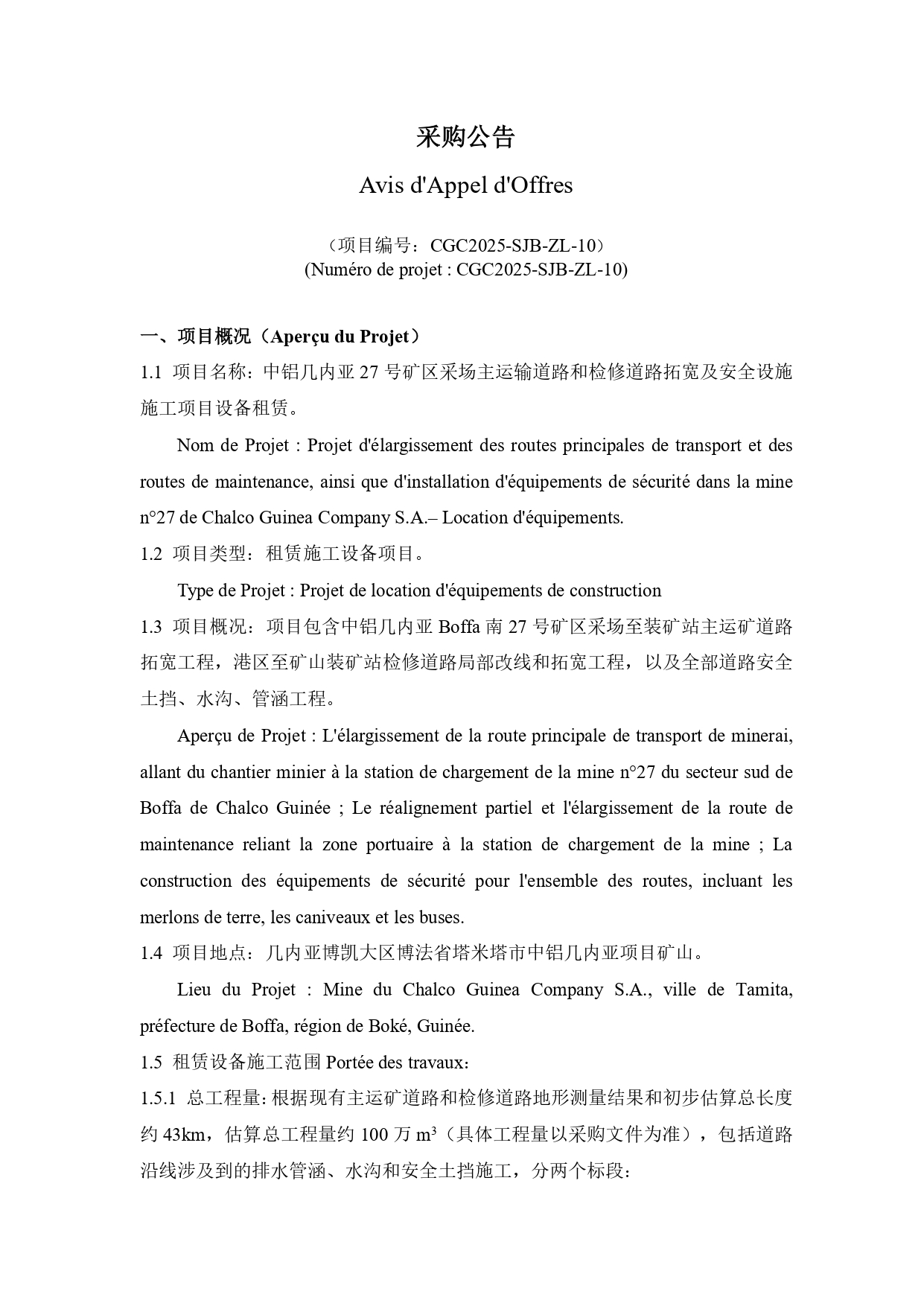 > Dossier d'Appel d'Offres pour la Location d'Équipements de Construction des Routes Principale de Transport et de Maintenance de la Mine N°27