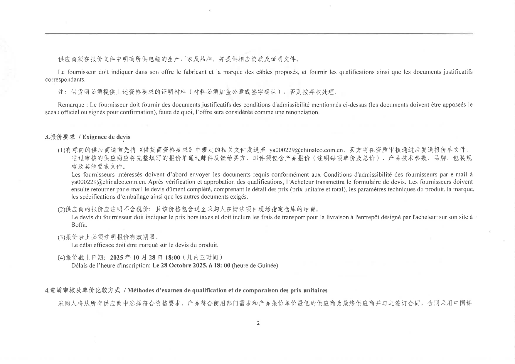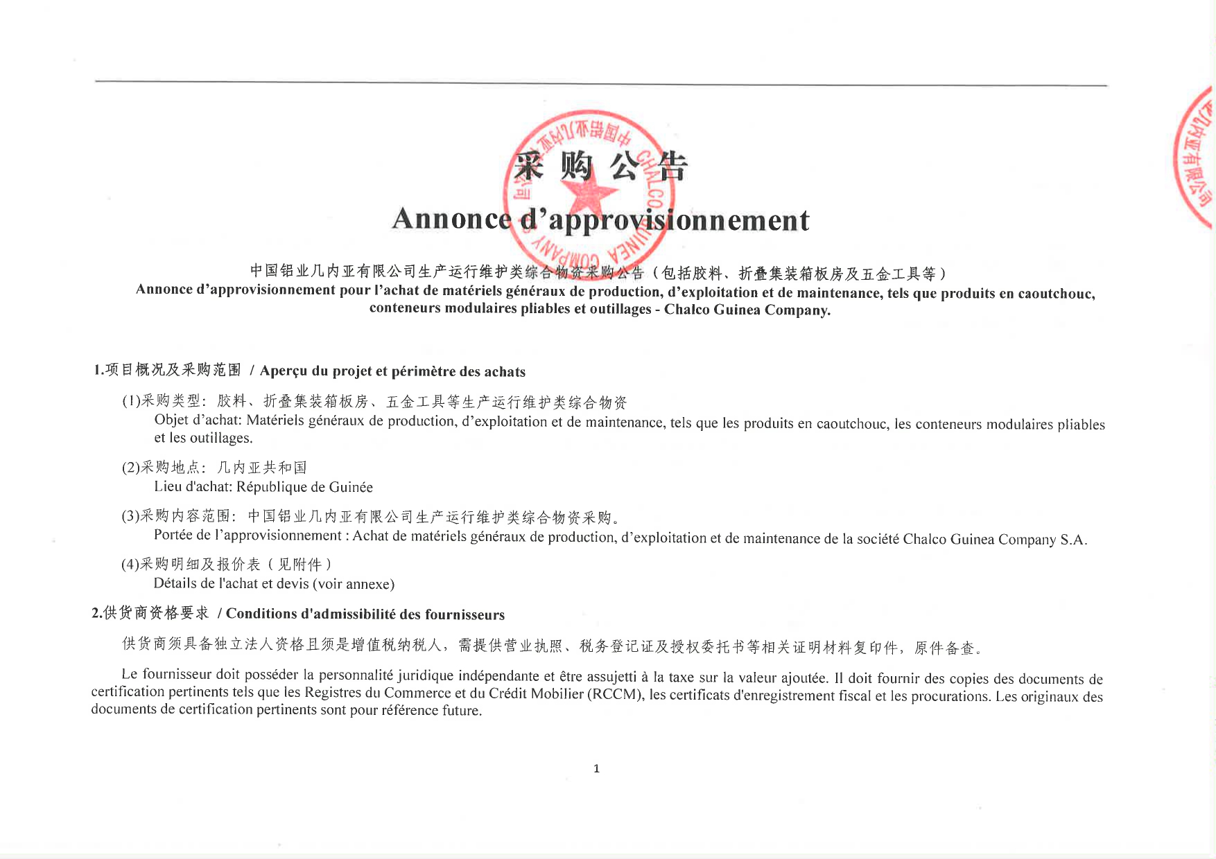 > Annonce d'approvisionnement pour l'achat de matériels généraux de production, d'exploitation et de maintenance