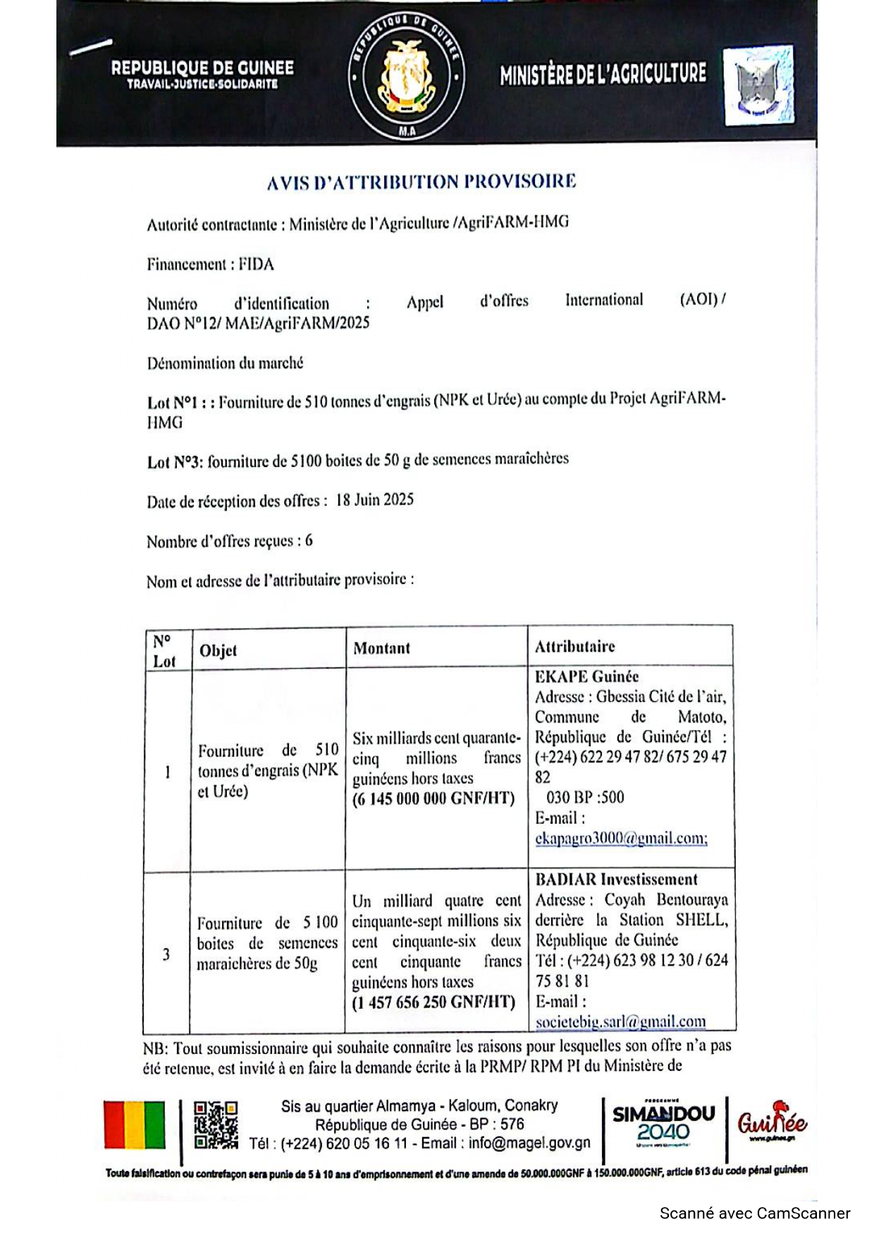 > Avis d'attribution provisoire: Fourniture de 510 tonnes d'engrais (NPK et Urée) au compte du Projet AgriFARM