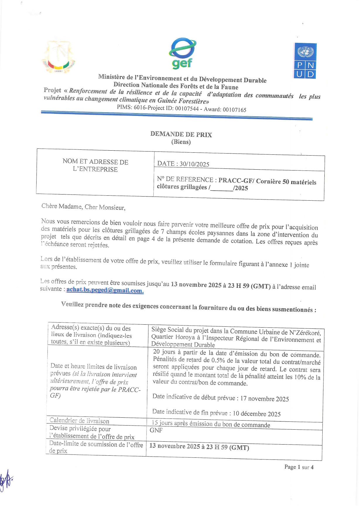 > demande de prix pour l'acquisition des matériels pour les clôtures grillagées de 7 champs écoles paysannes dans la zone d'intervention du projet