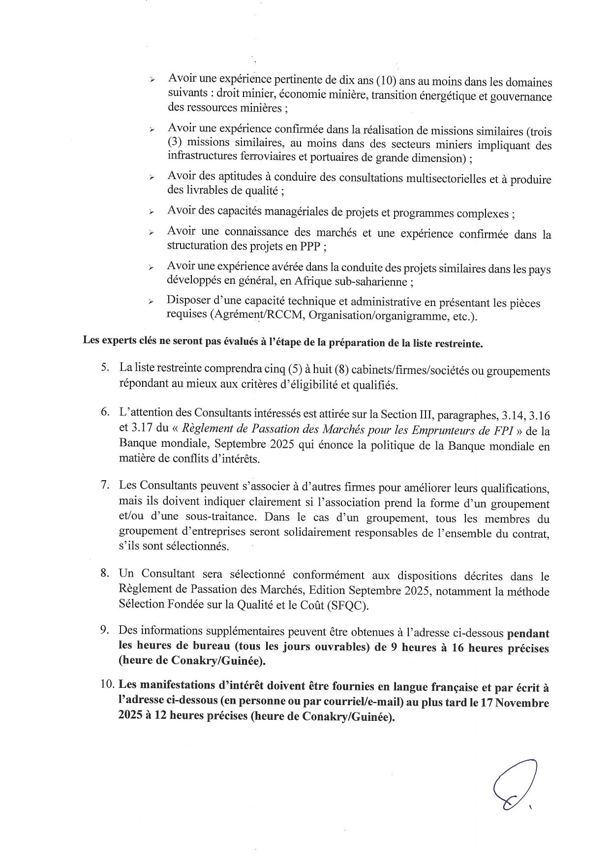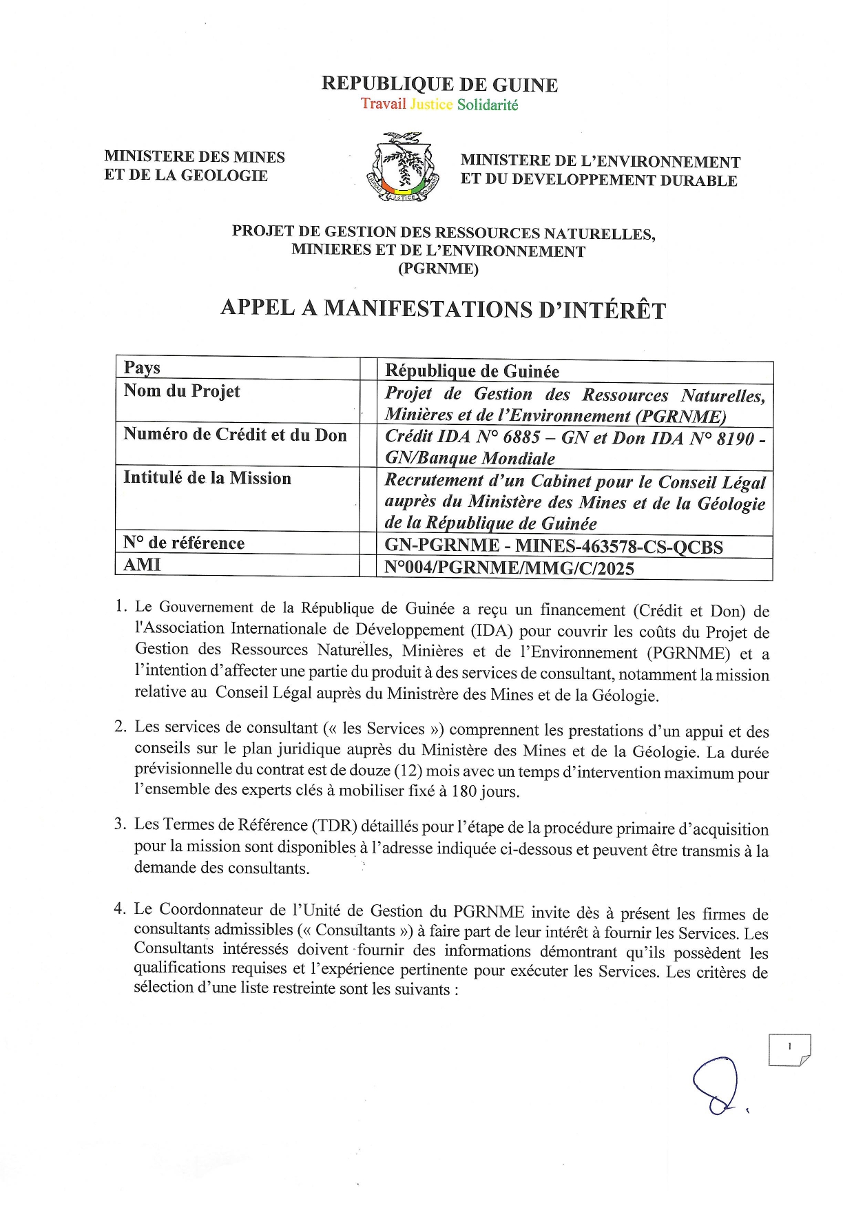 > Avis de Recrutement d’un Cabinet pour le Conseil Légal auprès du Ministère des Mines et de la Géologie de la République de Guinée
