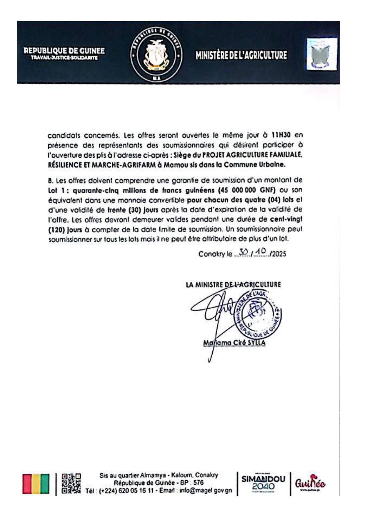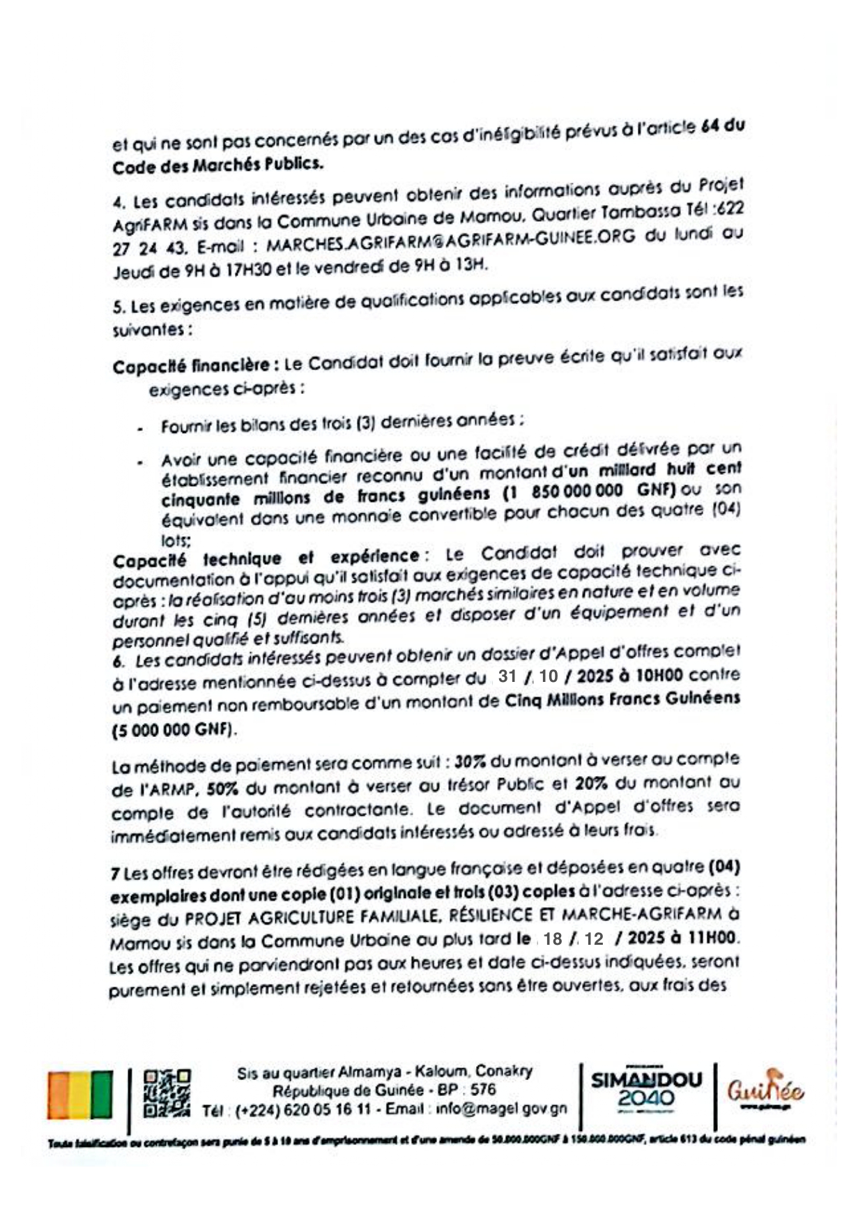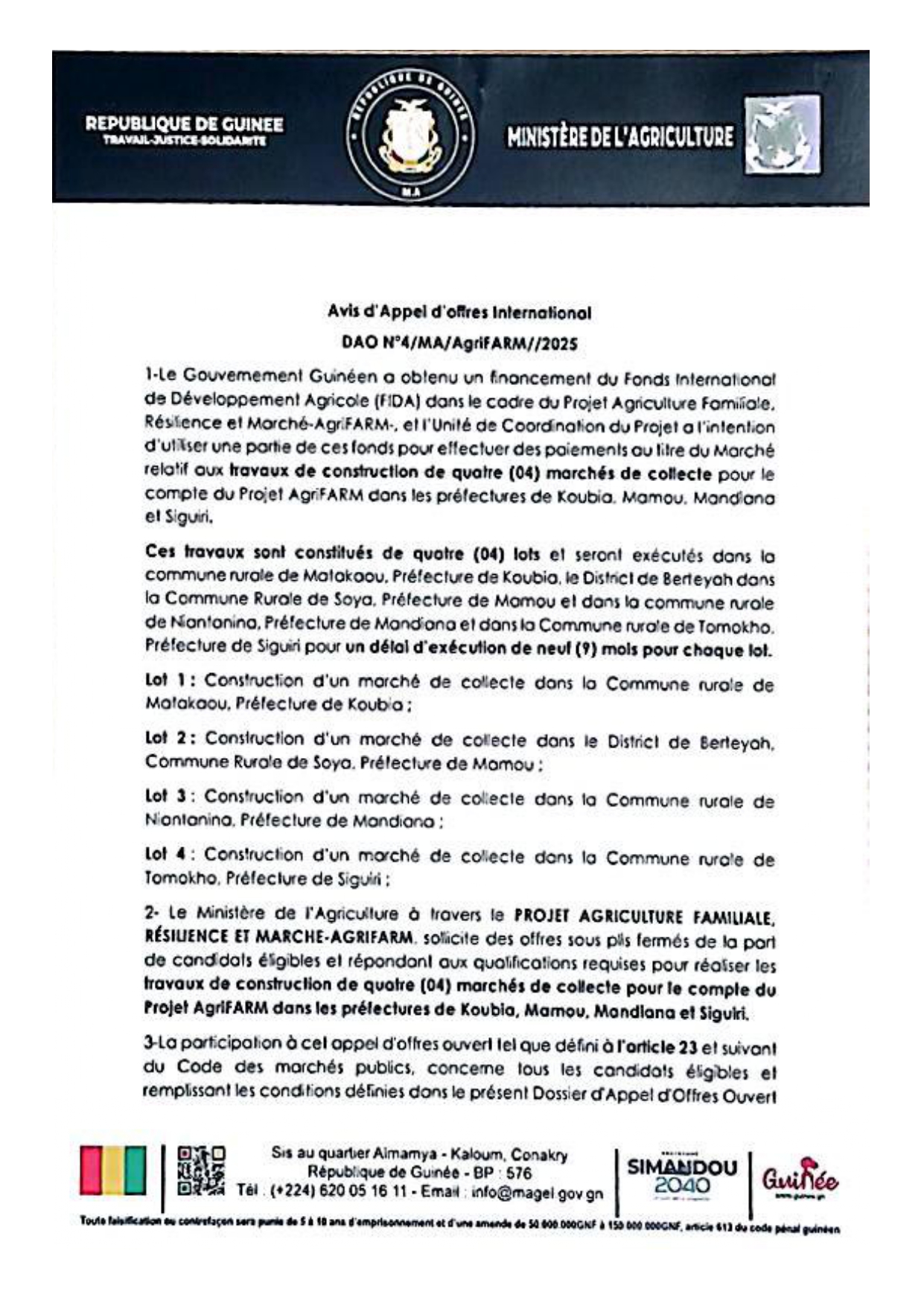 > Avis d'appel d'offres pour le marché relatif aux travaux de construction de quatre marchés de collecte pour le compte du projet Agrifarm