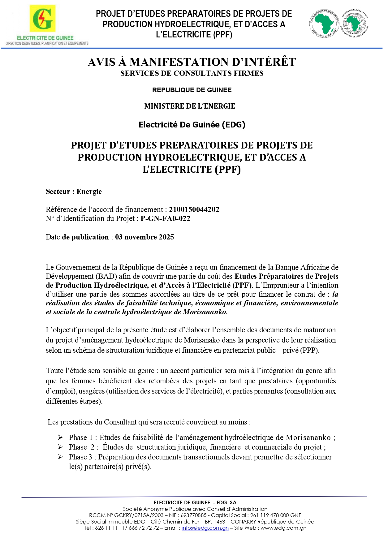 > Avis à manifestation d'intérêt pour la réalisation des études de faisabilité technique, économique et financière, environnementale et sociale de la centrale hydroélectrique de Morisananko
