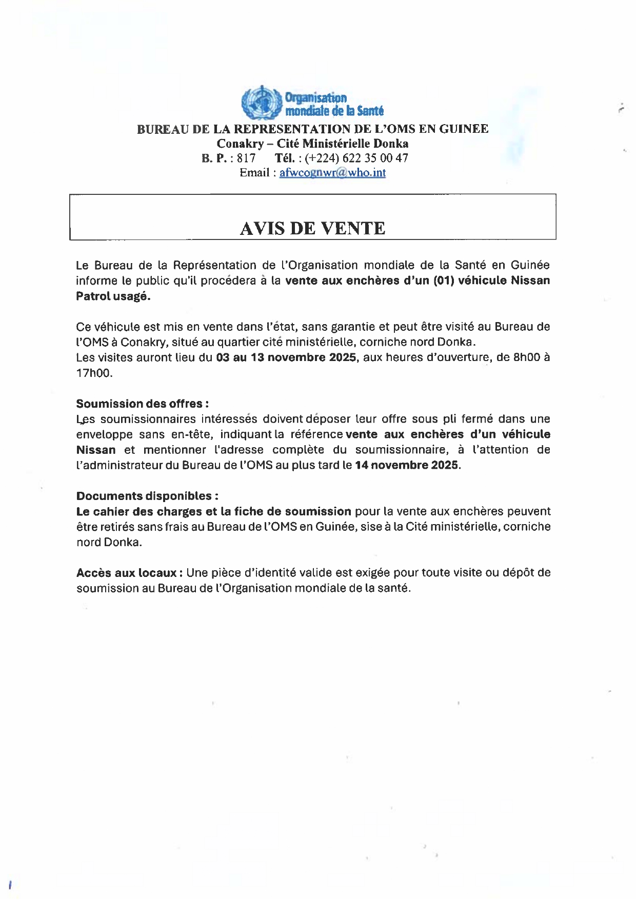 > Avis de vente aux enchères d’un (01) véhicule Nissan Patrol usagé
