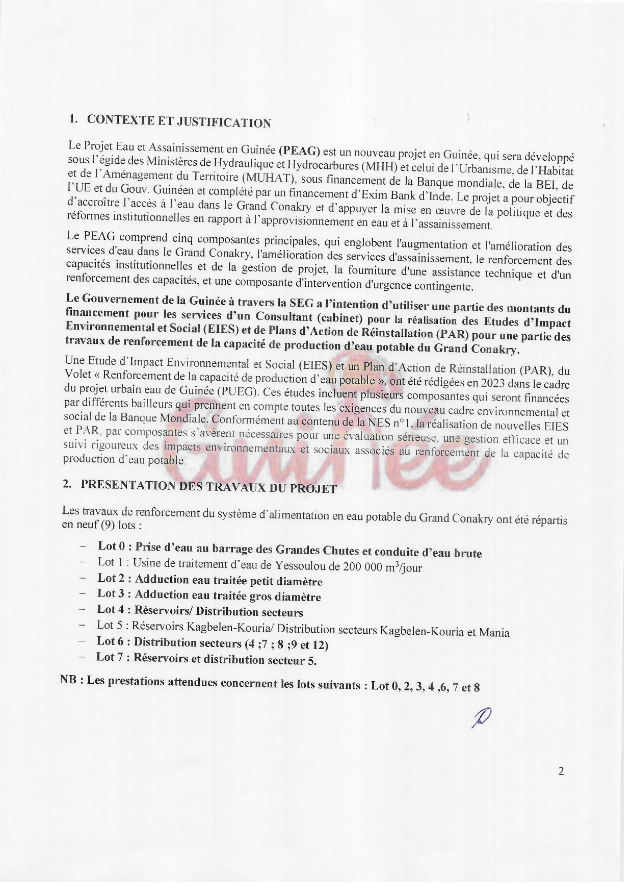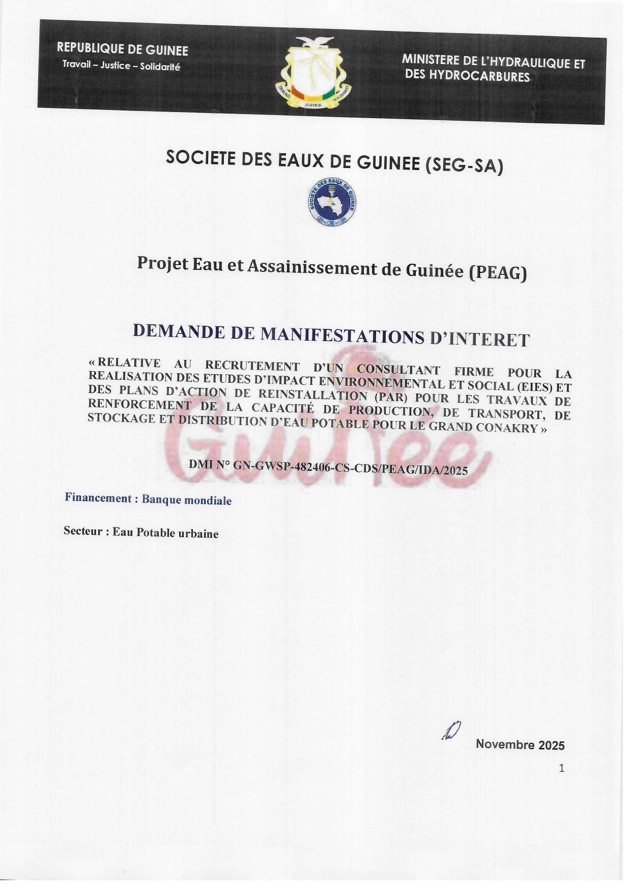 > PEAG - DEMANDE DE MANIFESTATIONS D'INTERET RELATIVE AU RECRUTEMENT D'UN CONSULTANT FIRME POUR LA REALISATION DES ETUDES D'IMPACT ENVIRONNEMENTAL ET SOCIAL (EIES) ET DES PLANS D'ACTION DE REINSTALLATION (PAR) POUR LES TRAVAUX DE RENFORCEMENT DE LA CAPACITÉ DE PRODUCTION, DE TRANSPORT, DE STOCKAGE ET DISTRIBUTION D'EAU POTABLE POUR LE GRAND CONAKRY