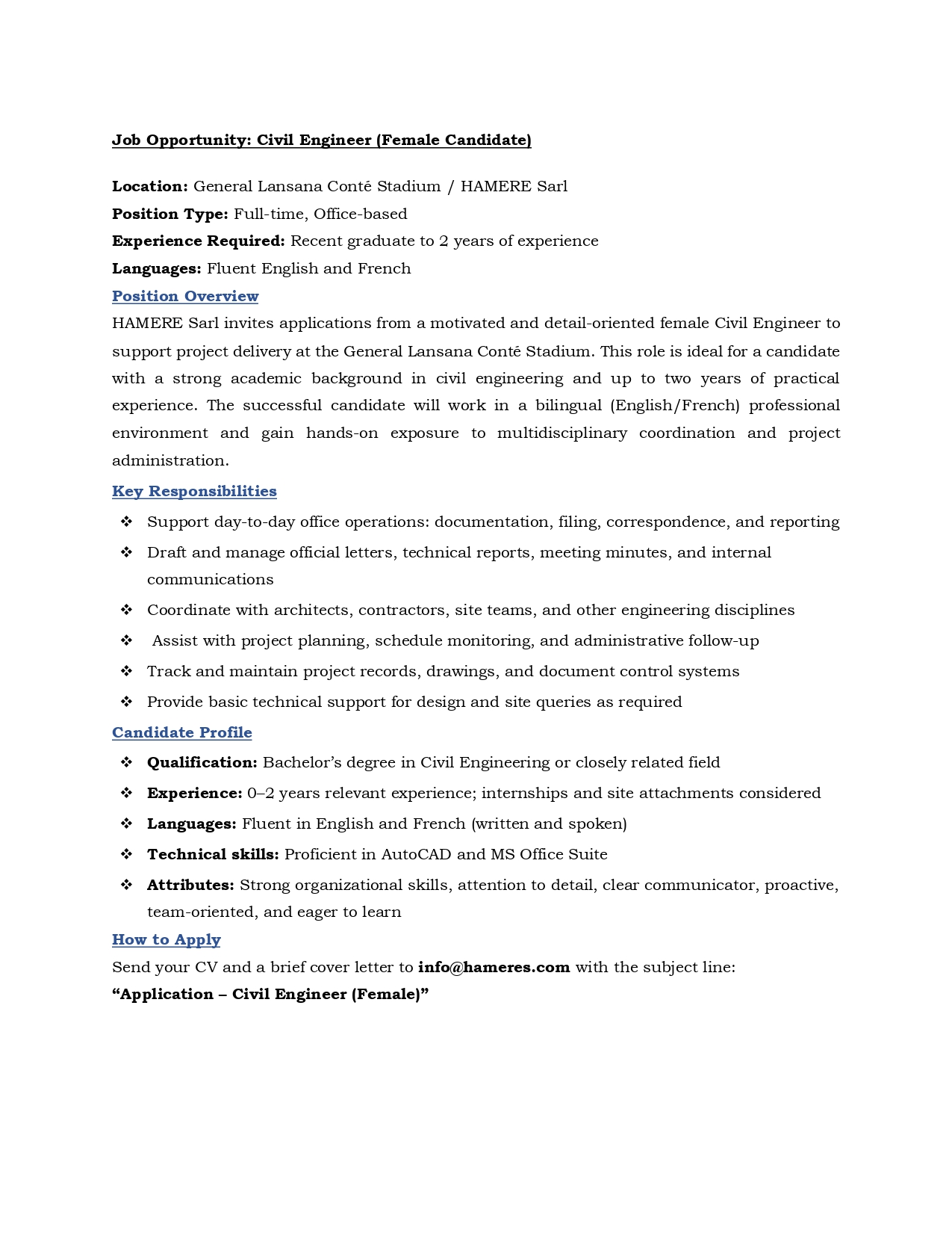 > Recrutement: Civil Engineer (Female Candidate)