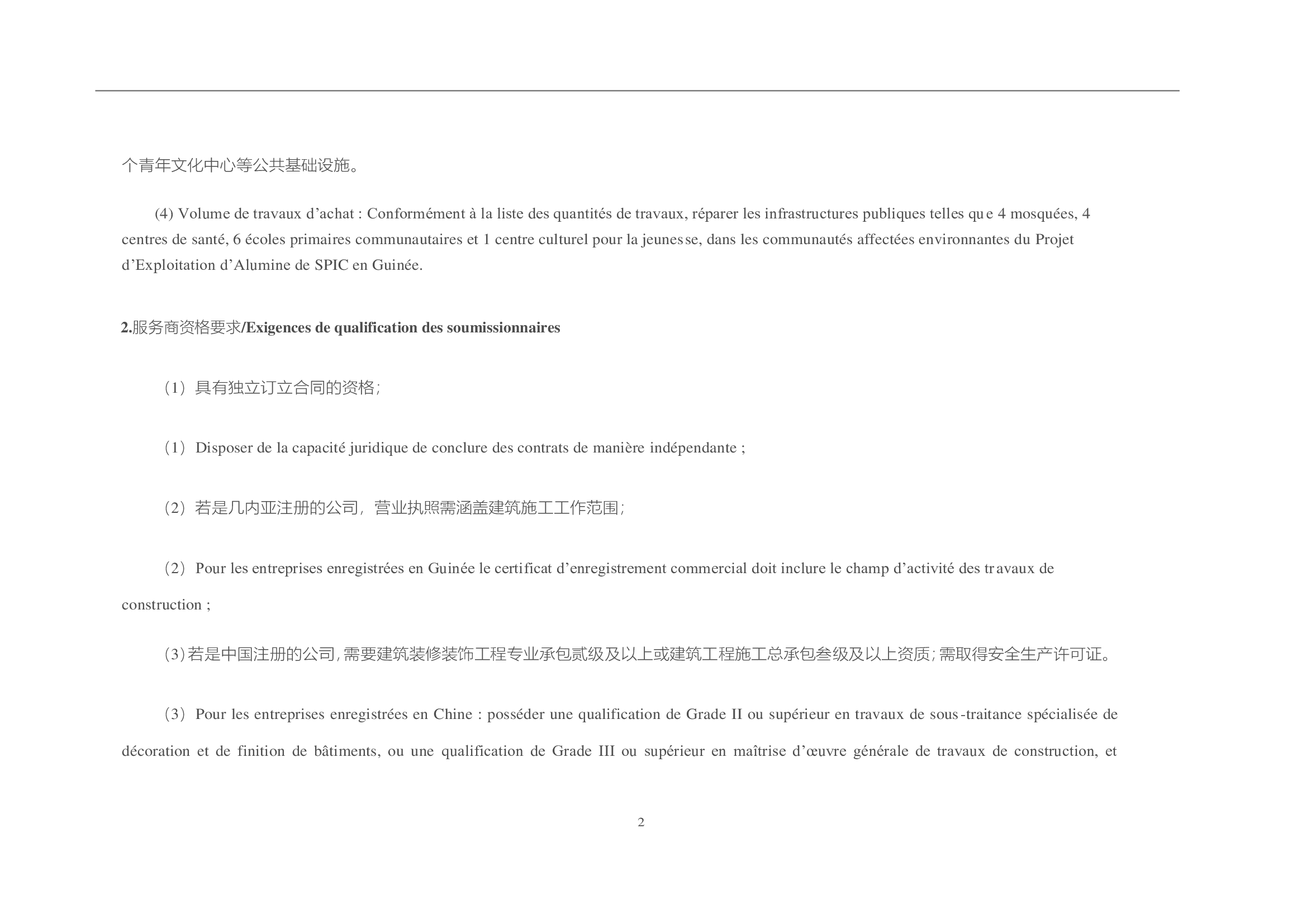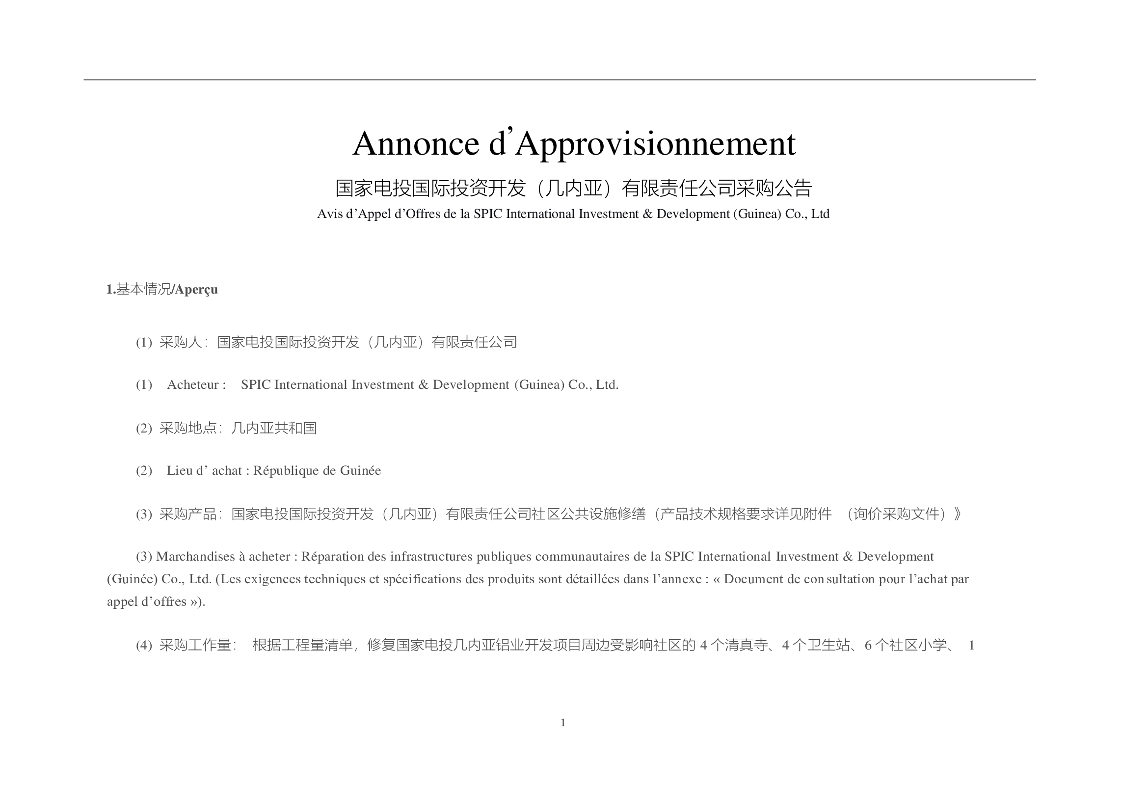 > Annonce d'approvisionnement: Réparation des infrastructures publiques communautaires de la SPIC International Investment & Development (Guinée) Co., Ltd