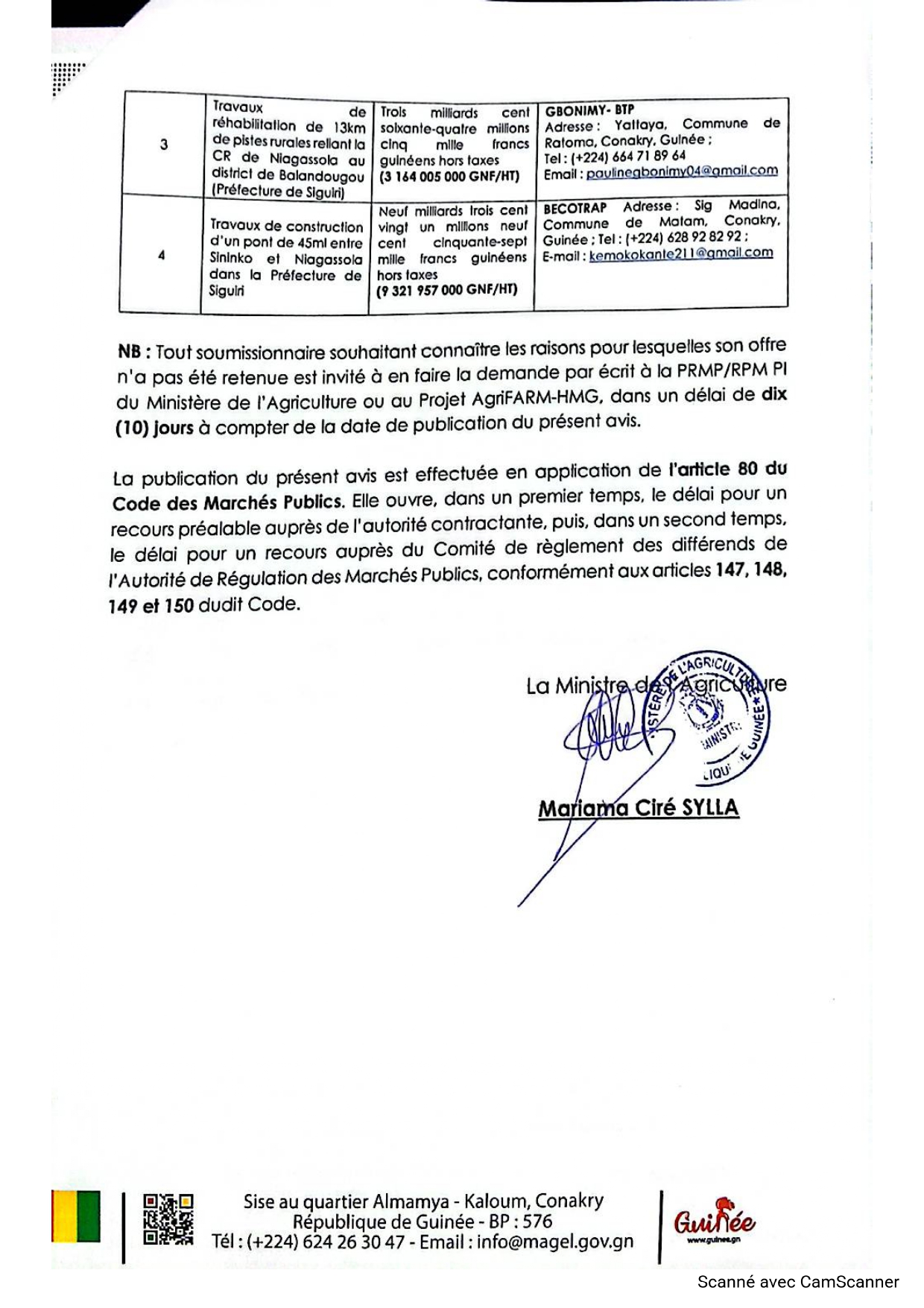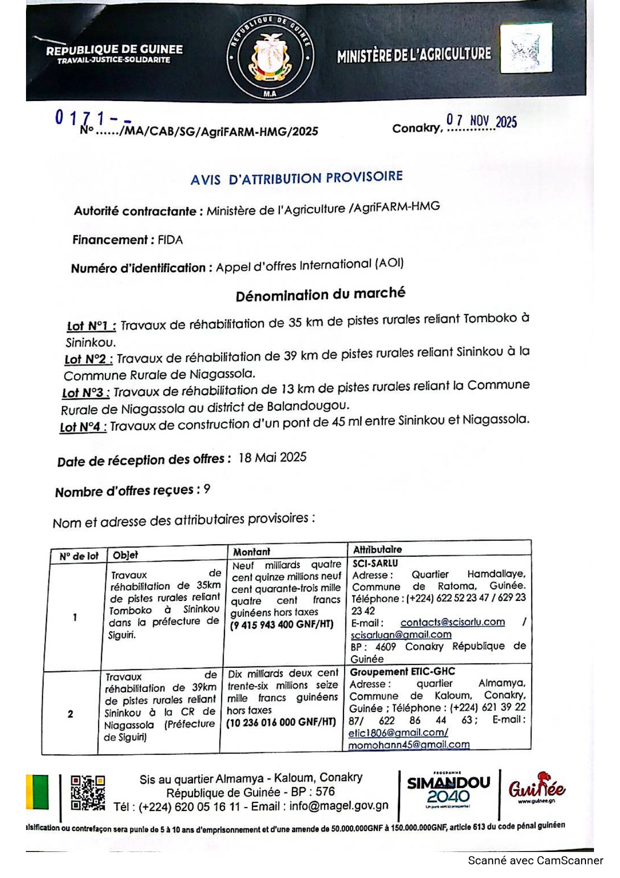 > AVIS D’ATTRIBUTION PROVISOIRE: Lot N°1 : Travaux de réhabilitation de 35 km de pistes rurales reliant Tomboko à Sininkou Lot N°2 : Travaux de réhabilitation de 39 km de pistes rurales reliant Sininkou à la Commune Rurale de Niagassola