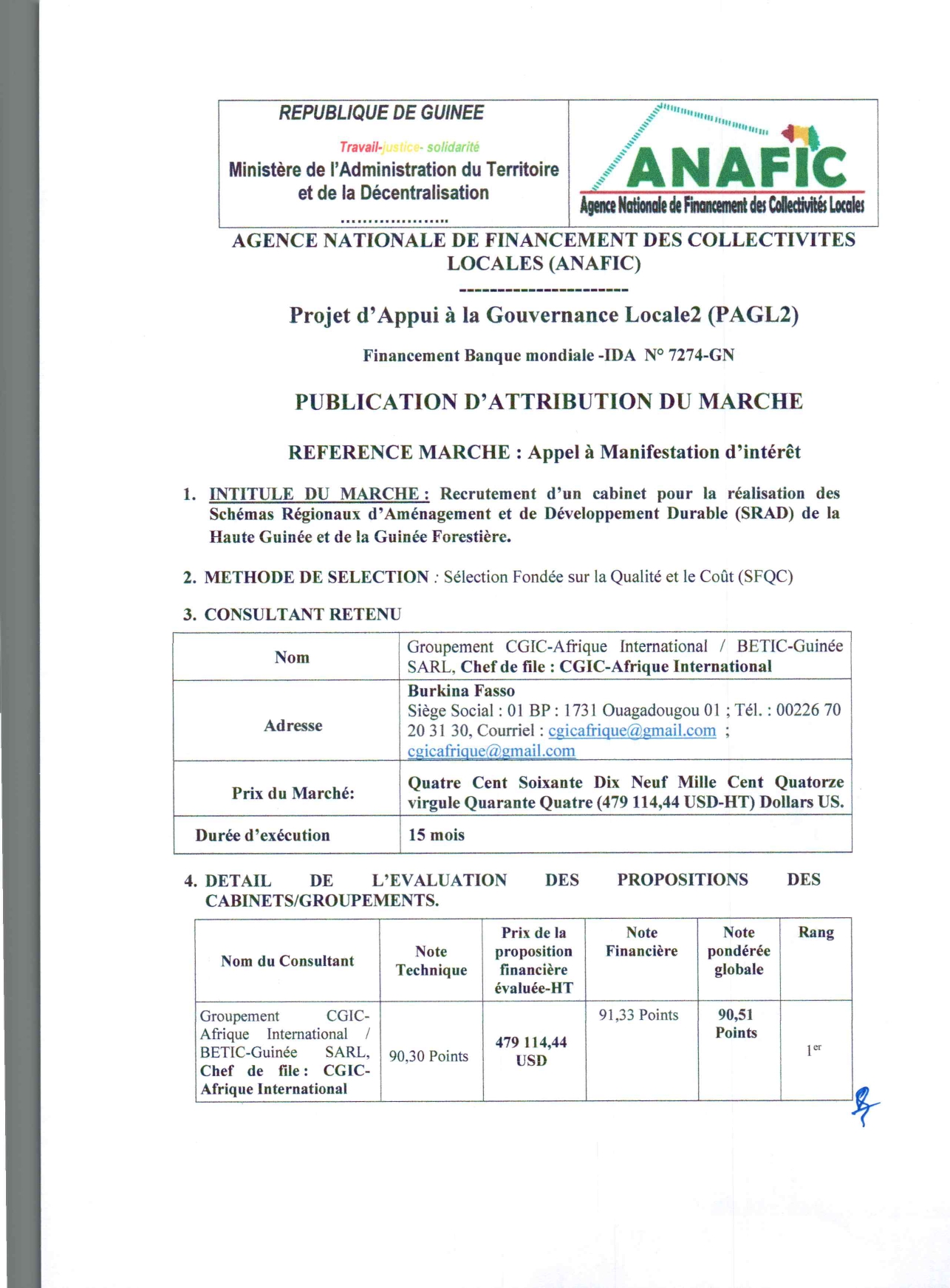 > PUBLICATION NOTIFICATION D'INTENTION D'ATTRIBUTION : Recrutement d’un cabinet pour la réalisation des Schémas Régionaux d’Aménagement et de Développement Durable (SRAD) de la Haute Guinée et de la Guinée Forestière