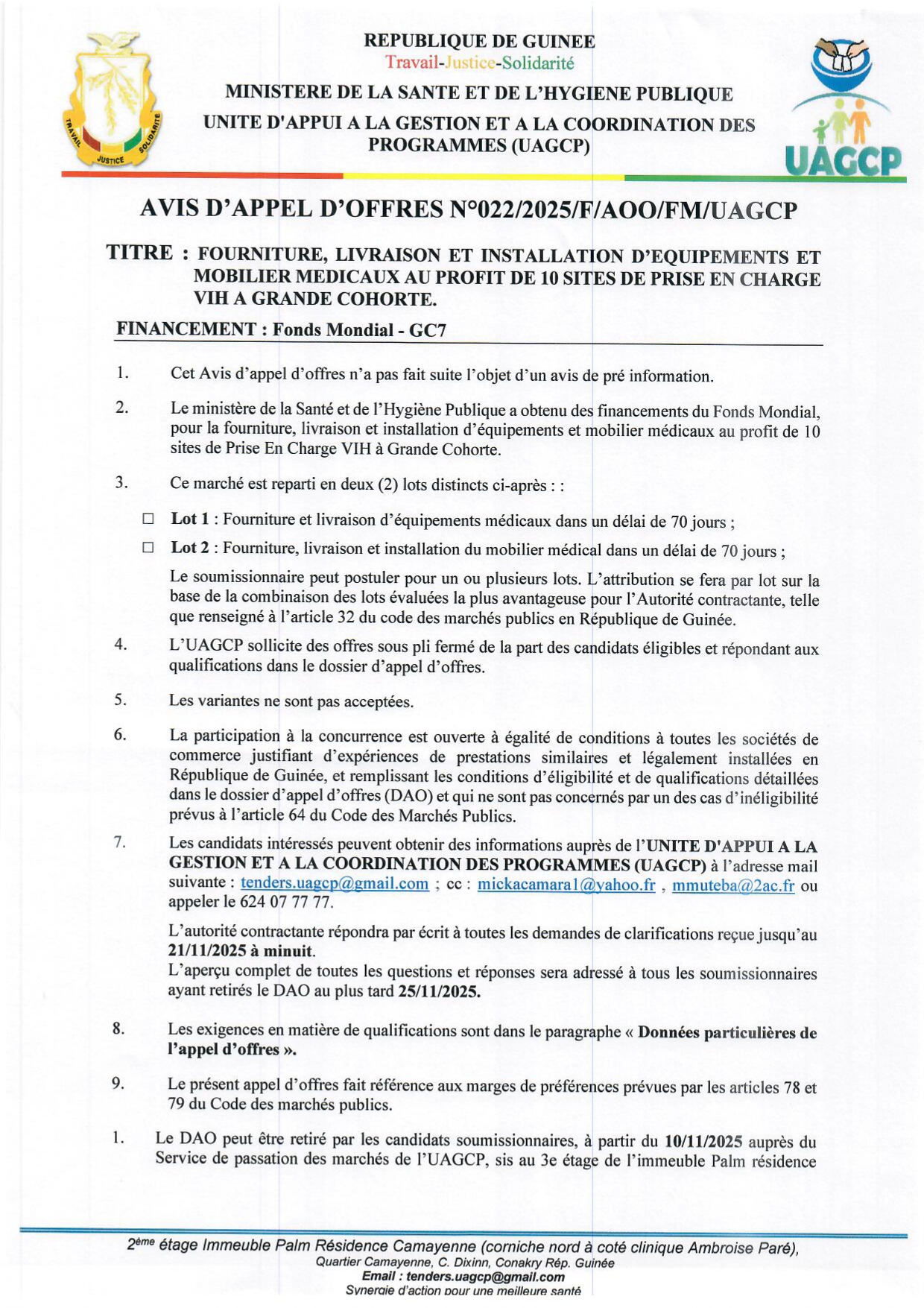 > AVIS D'APPEL D'OFFRES POUR LA FOURNITURE, LIVRAISON ET INSTALLATION D’EQUIPEMENTS ET MOBILIER MEDICAUX AU PROFIT DE 10 SITES DE PRISE EN CHARGE VIH A GRANDE COHORTE.