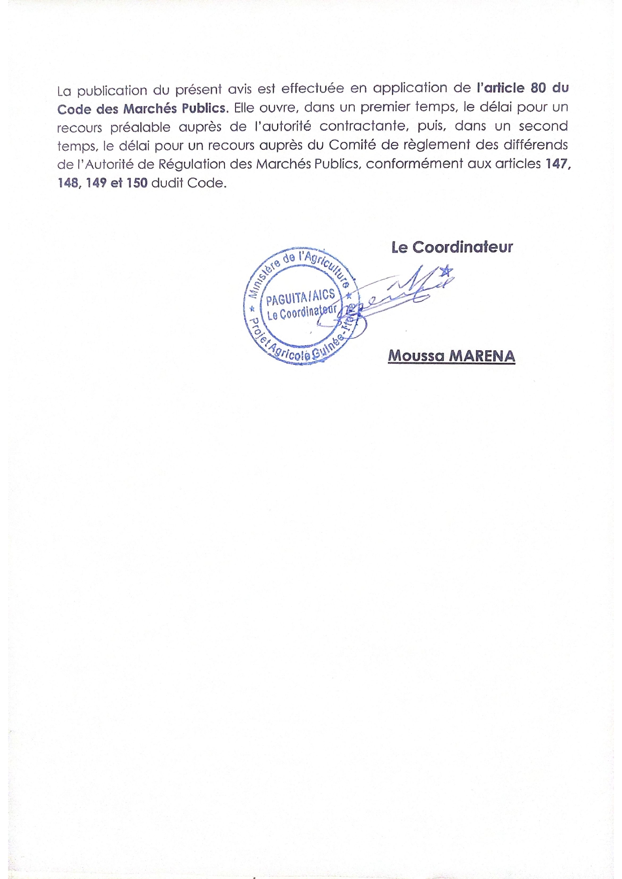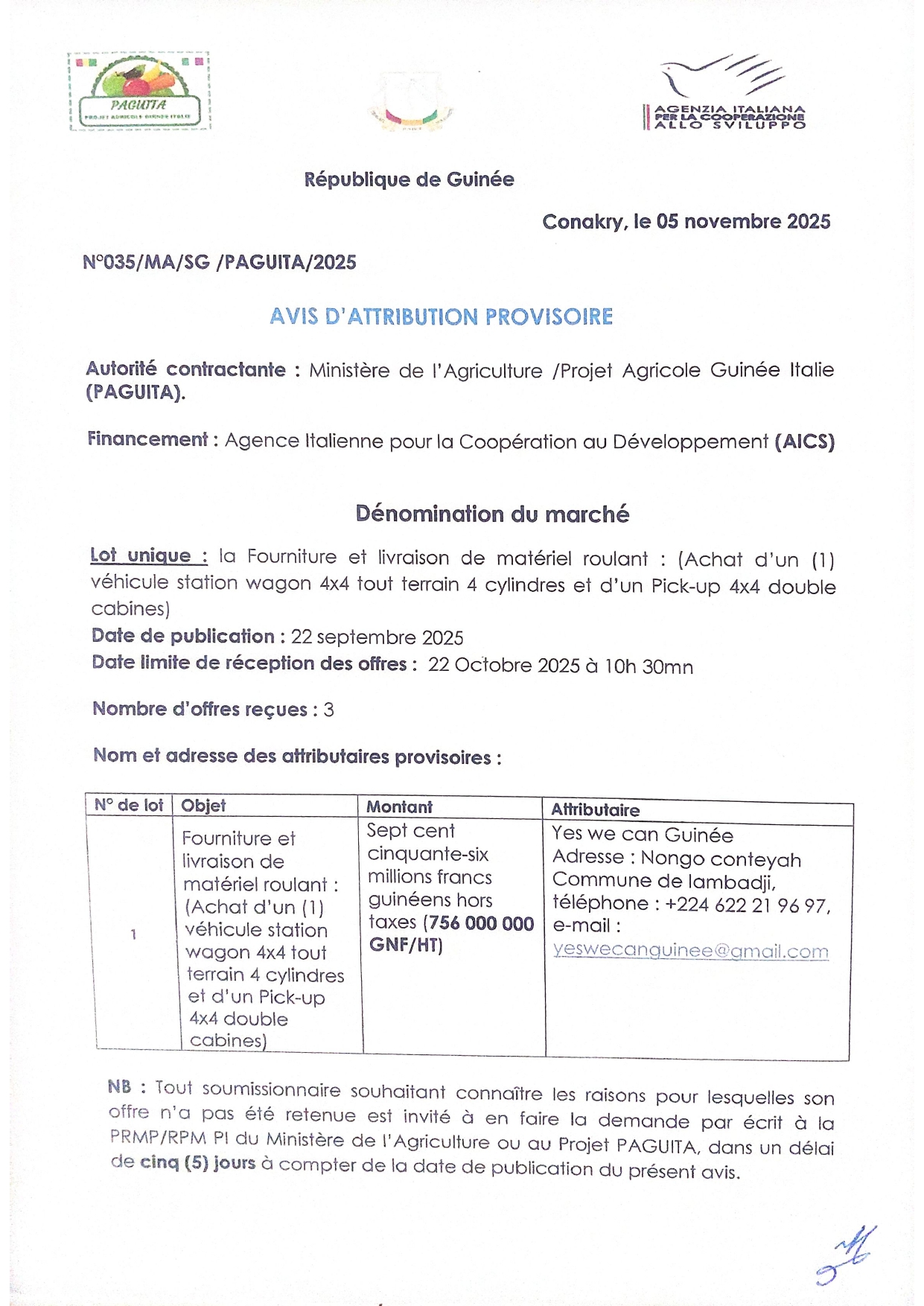 > AVIS D'ATTRIBUTION PROVISOIR: la fourniture et livraisonde matériel roulant : (Achat d'un véhicule station wagon 4x4 tout terrain 4 cylindre et d'un pick-up 4x4 double cabine)