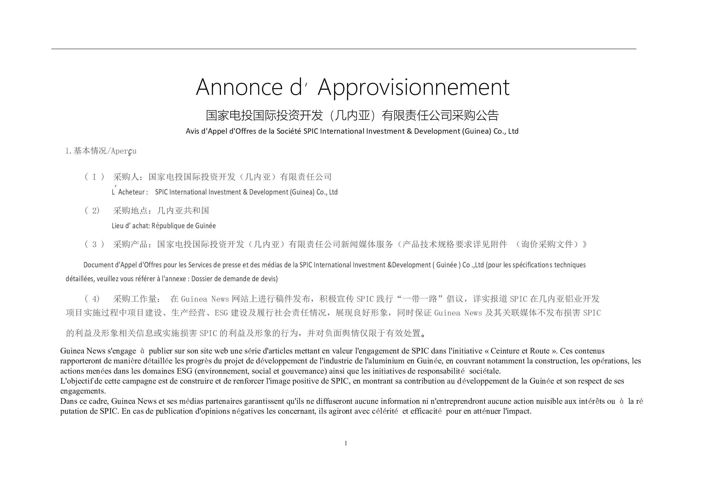 > Avis d'Appel d'Offres pour les Services de presse et des médias de la SPIC International Investment &Development ( Guinée ) Co .,Ltd