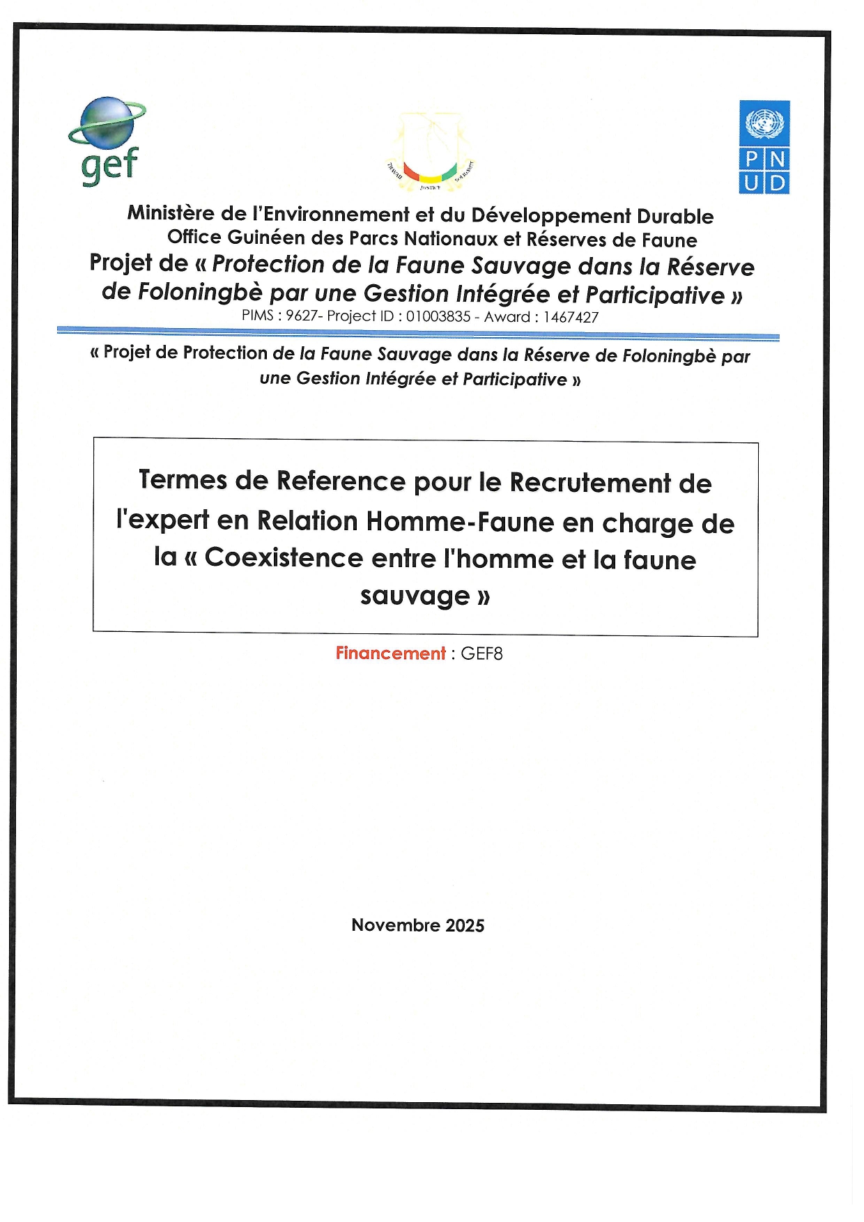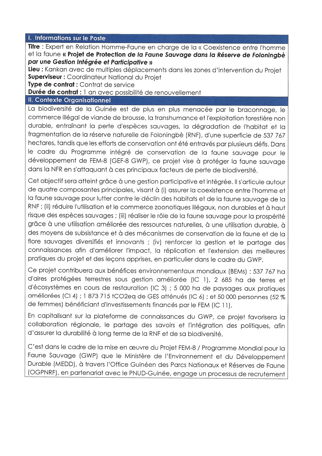 > Termes de Reference pour le Recrutement de l'expert en Relation Homme-Faune en charge de la « Coexistence entre l'homme et la faune sauvage »