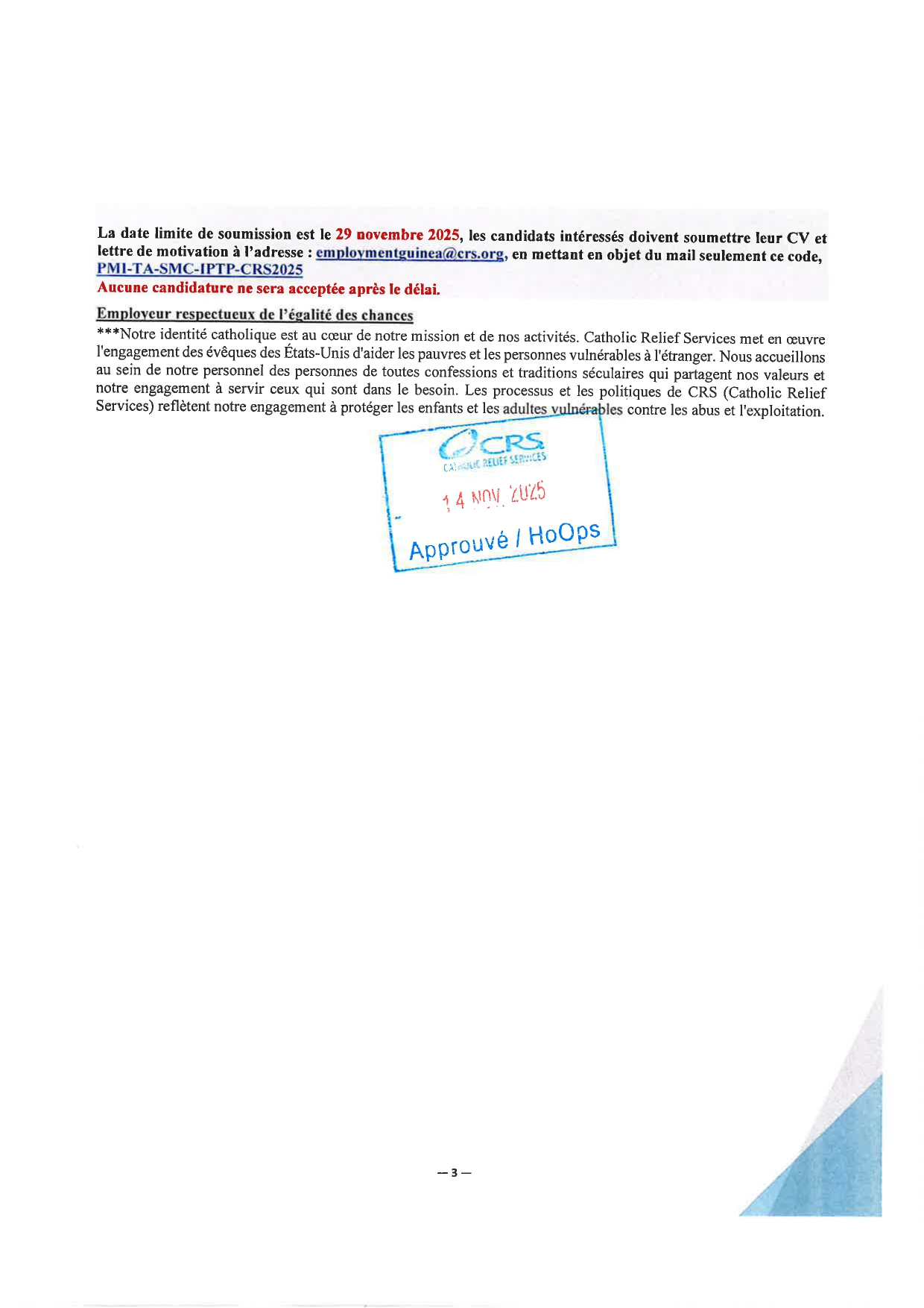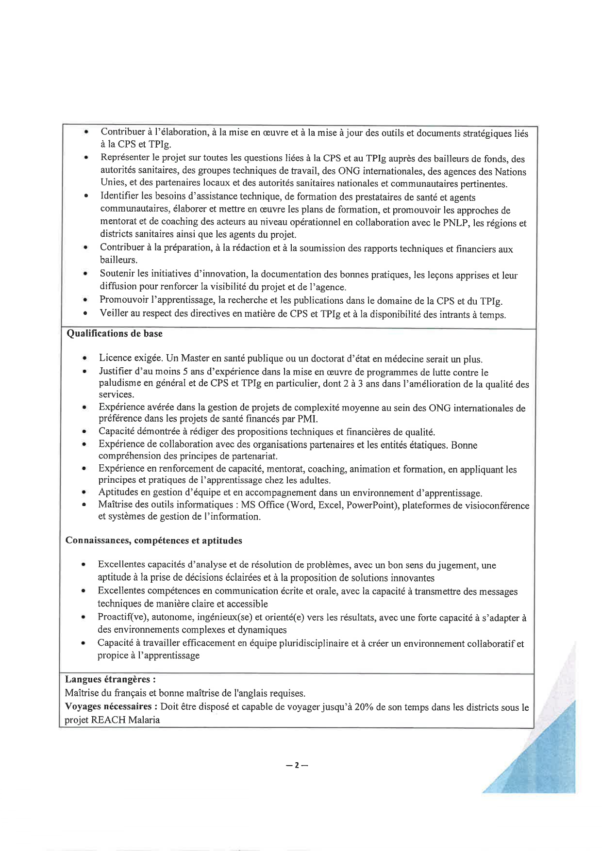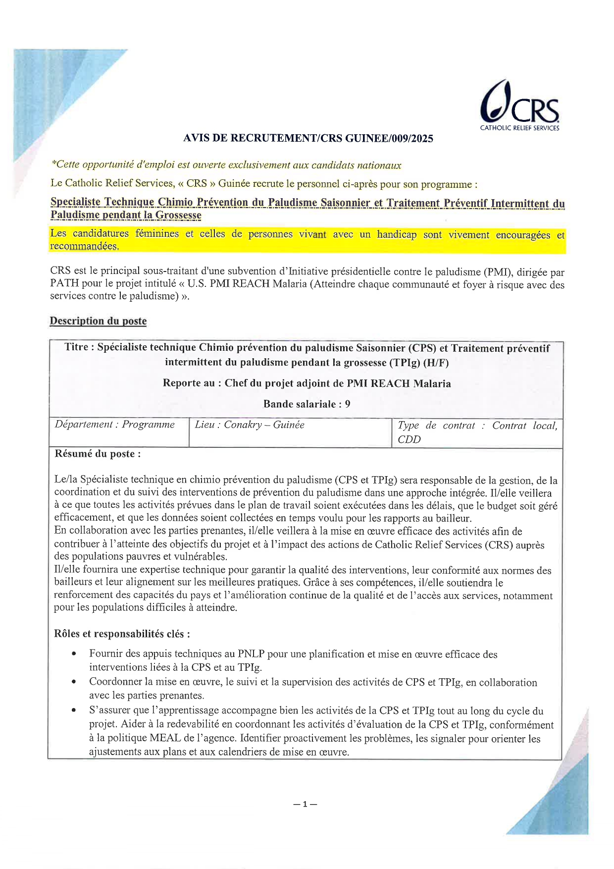 > Avis de recrutement d'un Spécialiste Technique Chimio Prévention du paludisme Saisonnier (CPS) et Traitement préventif intermittent du paludisme pendant la grossesse (TPIg) (H/F)