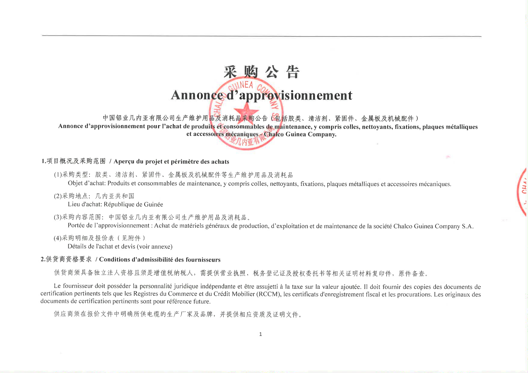 > Annonce d'approvisionnement pour l'achat de produits et consommables de maintenance, y compris colles, nettoyants, fixations, plaques métalliques et accessoires mécaniques - Chalco Guinea Company