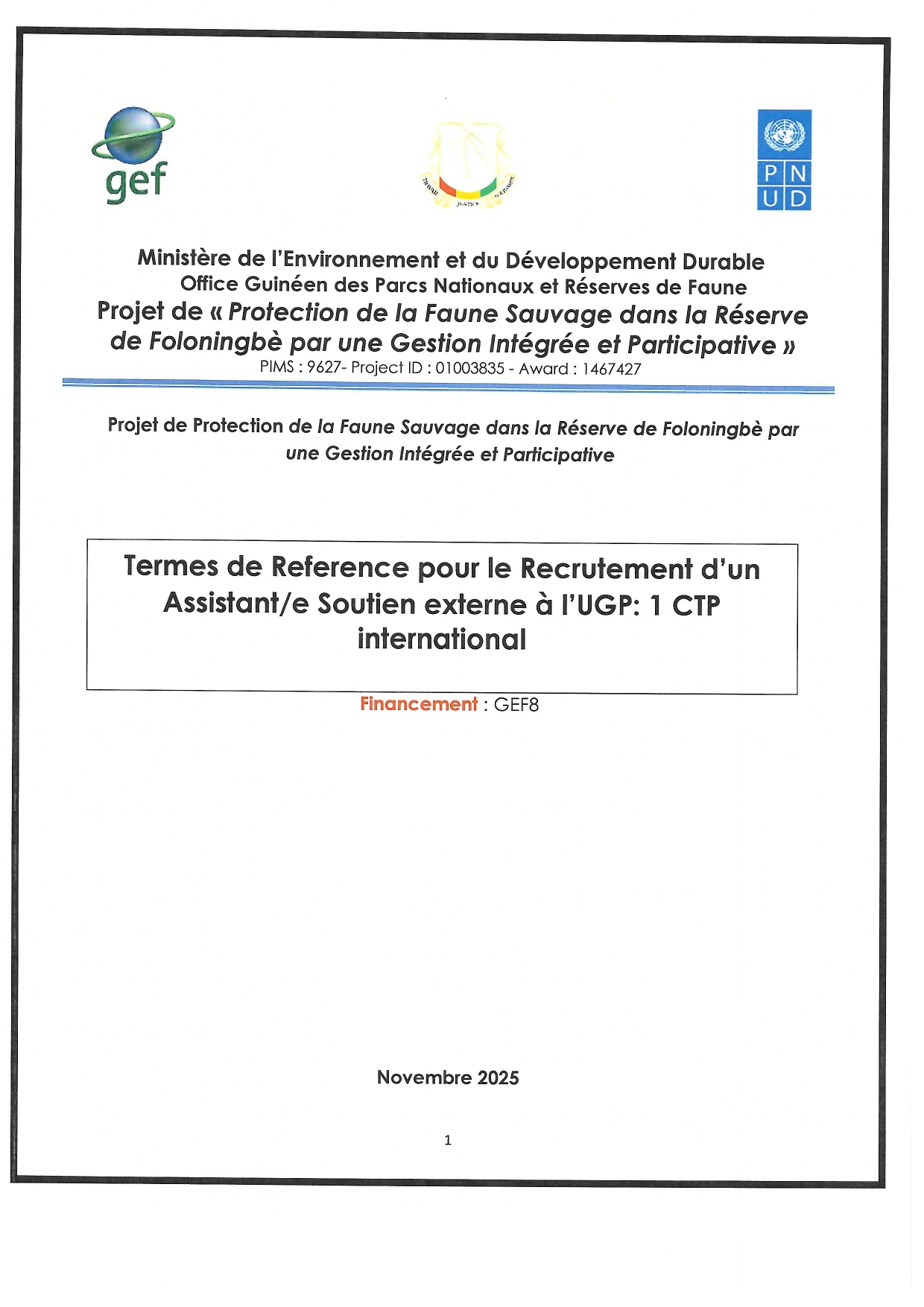 > Termes de Reference pour le Recrutement d'un Assistant/e Soutien externe à l'UGP: 1 CTP international