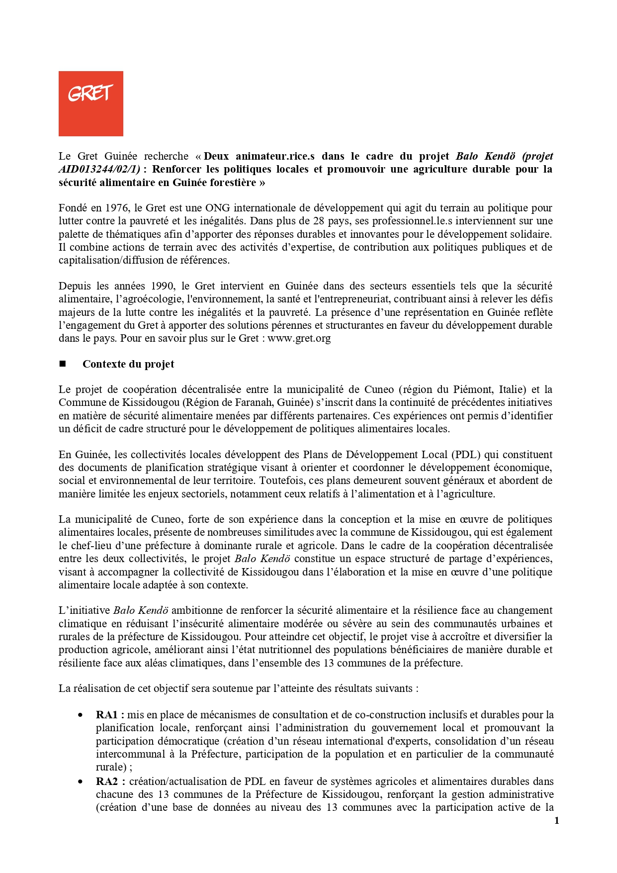 > Avis de recrutement de Deux animateur.rice.s dans le cadre du projet Balo Kendö (projet AID013244/02/1) : Renforcer les politiques locales et promouvoir une agriculture durable pour la sécurité alimentaire en Guinée forestière