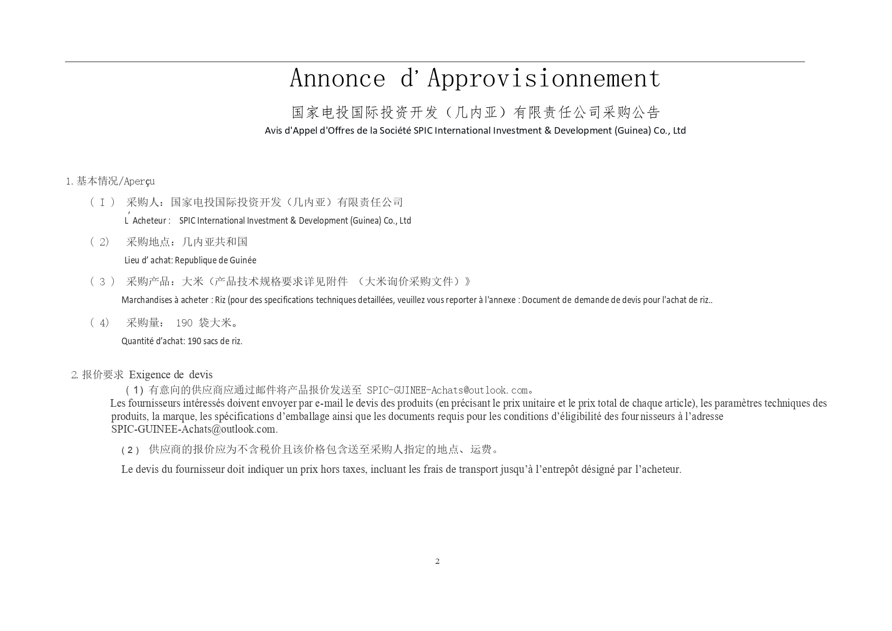> Avis d'appel d'offres pour l'achat de Riz (pour des specifications techniques detaillées, veuillez vous reporter à l'annexe : Document de demande de devis pour l'achat de riz)