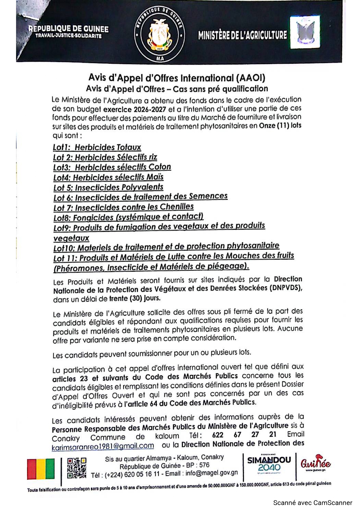 > Avis d'appel d'offres pour le Marché de fourniture et livraison sur sites des produits et matériels de traitement phytosanitaires en Onze (11) lots