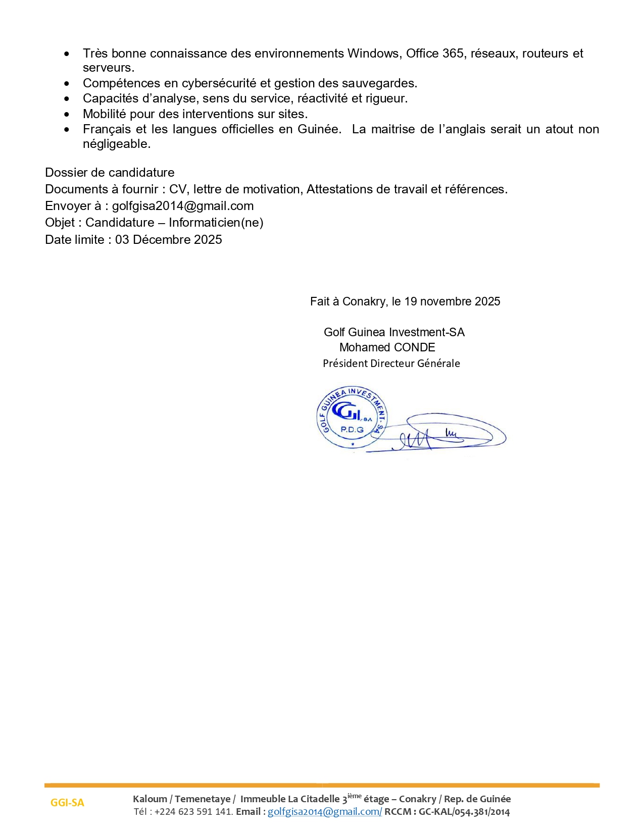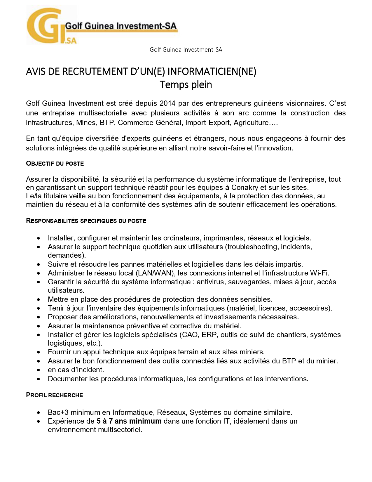 > AVIS DE RECRUTEMENT D’UN(E) INFORMATICIEN(NE)