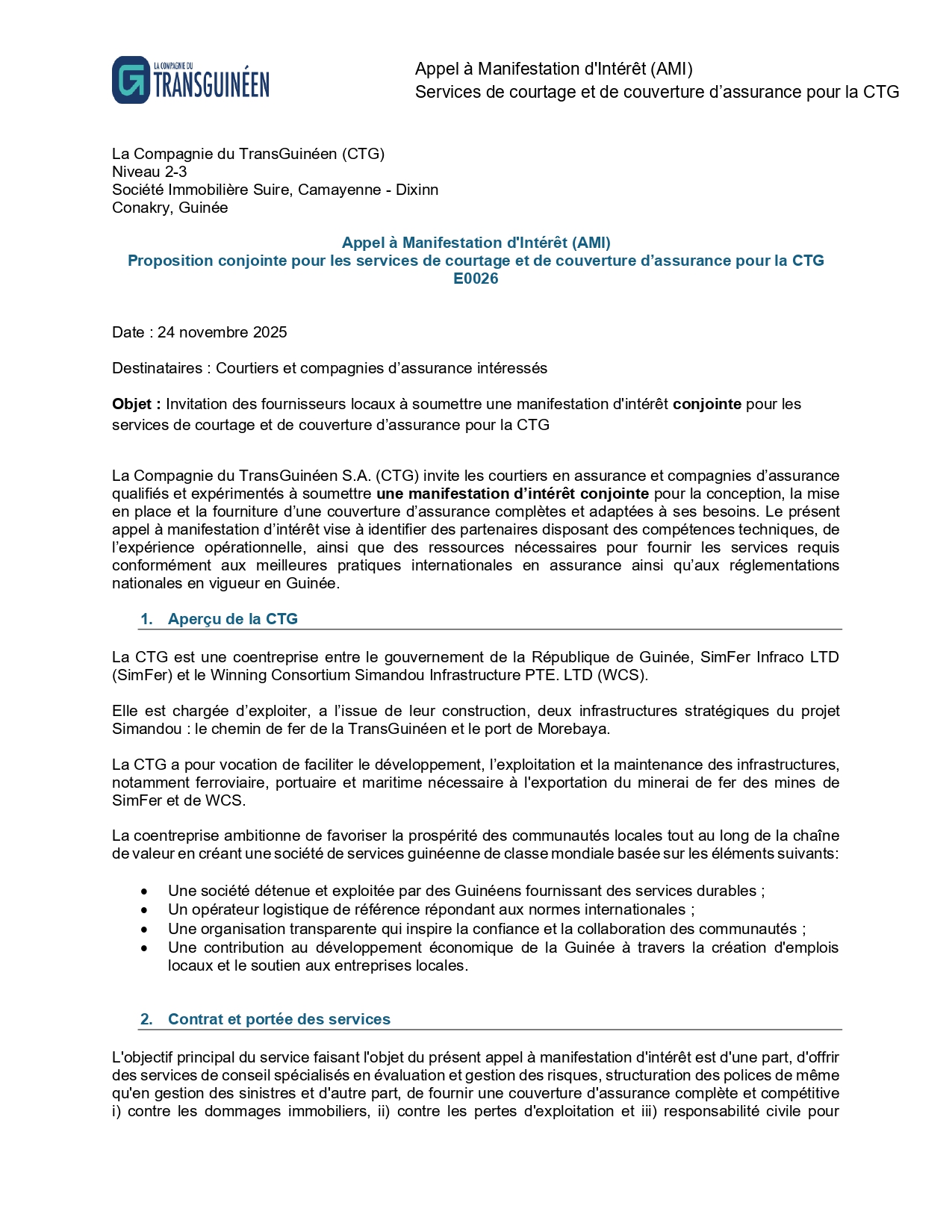 > Appel à Manifestation d'Intérêt (AMI) Pour Proposition conjointe pour les services de courtage et de couverture d’assurance pour la CTG E0026