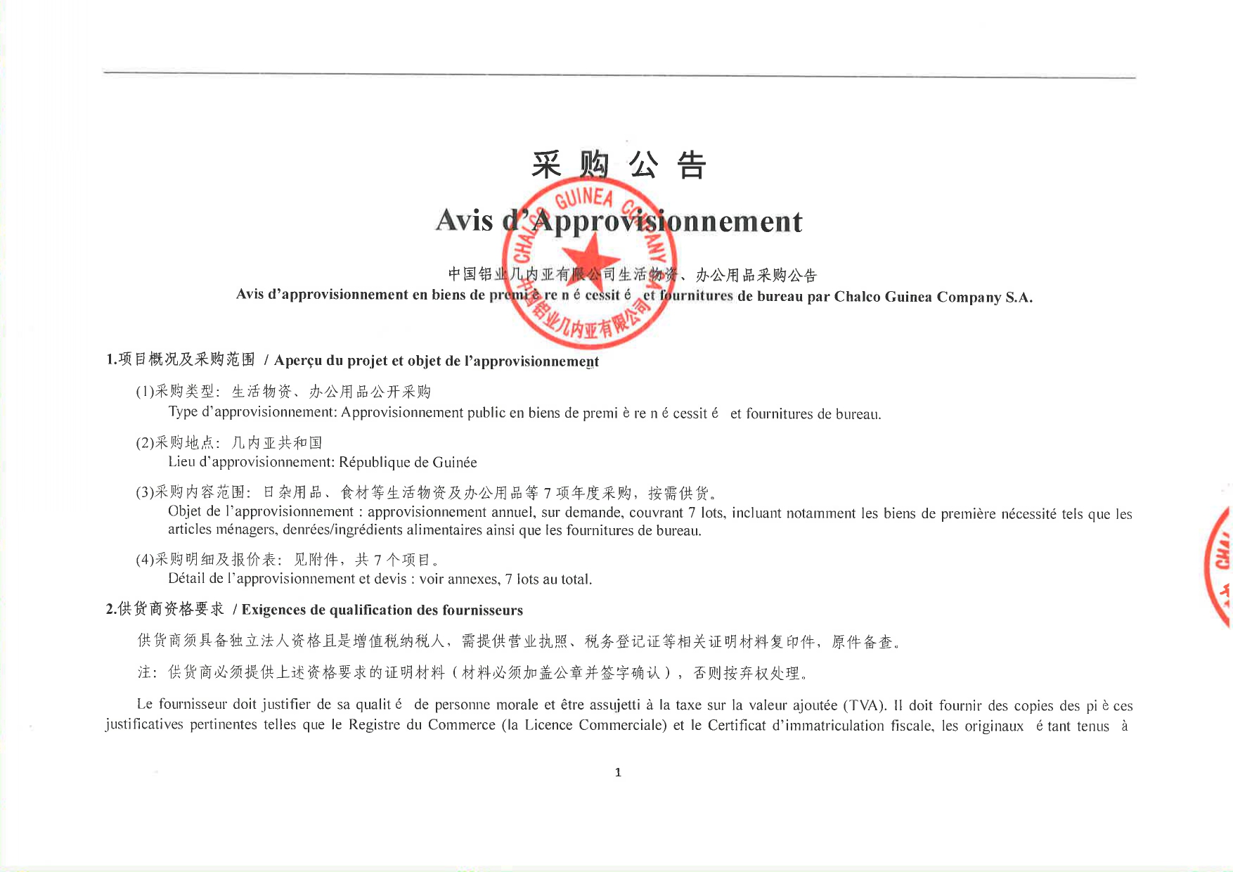 > Approvisionnement public en biens de première nécessité et fournitures de bureau par Chalco Guinea Company S.A.