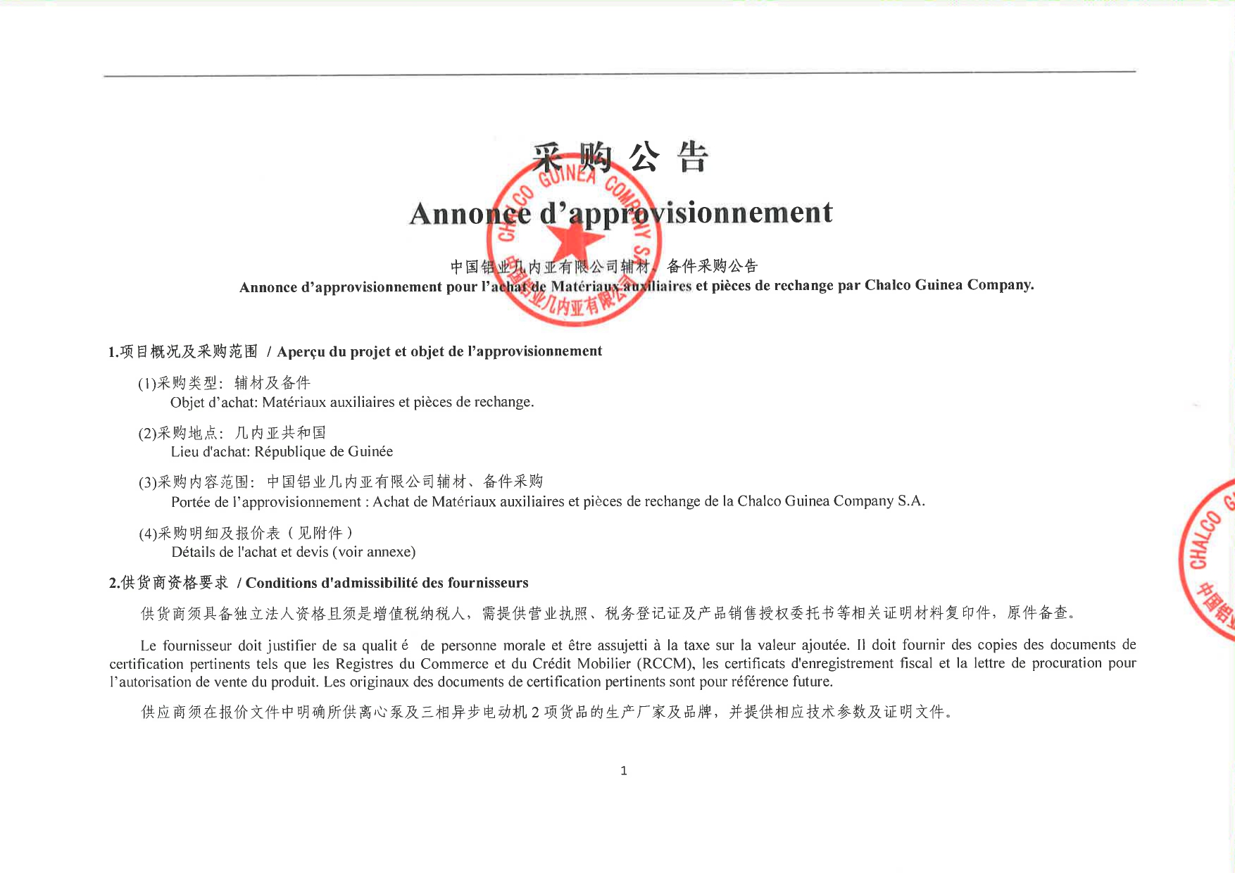> Annonce d'approvisionnement pour l'achat de matériaux auxiliaires et pièces de rechange par Chalco Guinea Company