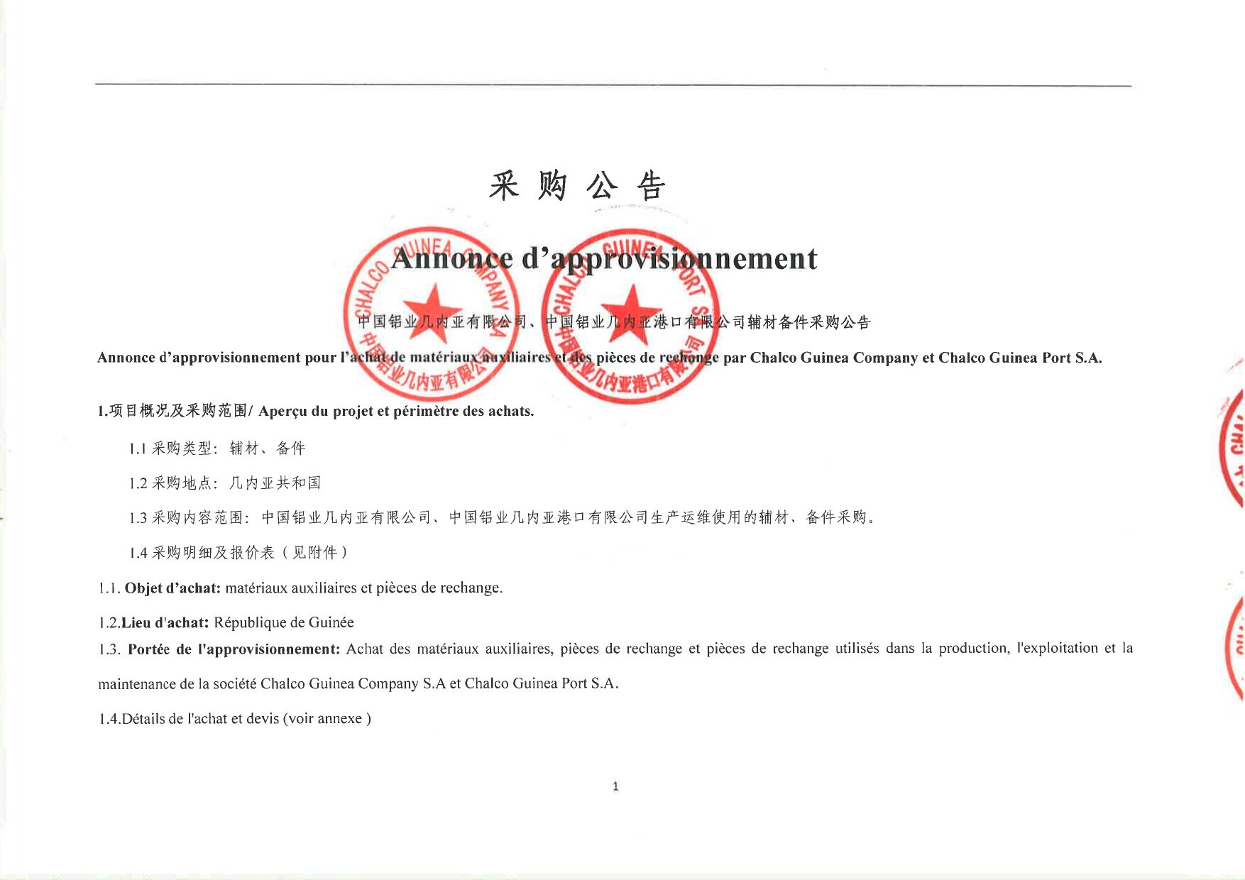 > Annonce d'approvisionnement pour l'achat de matériaux auxiliaires et pièces de rechange par Chalco Guinea Company et Chalco Guinea Port S.A.