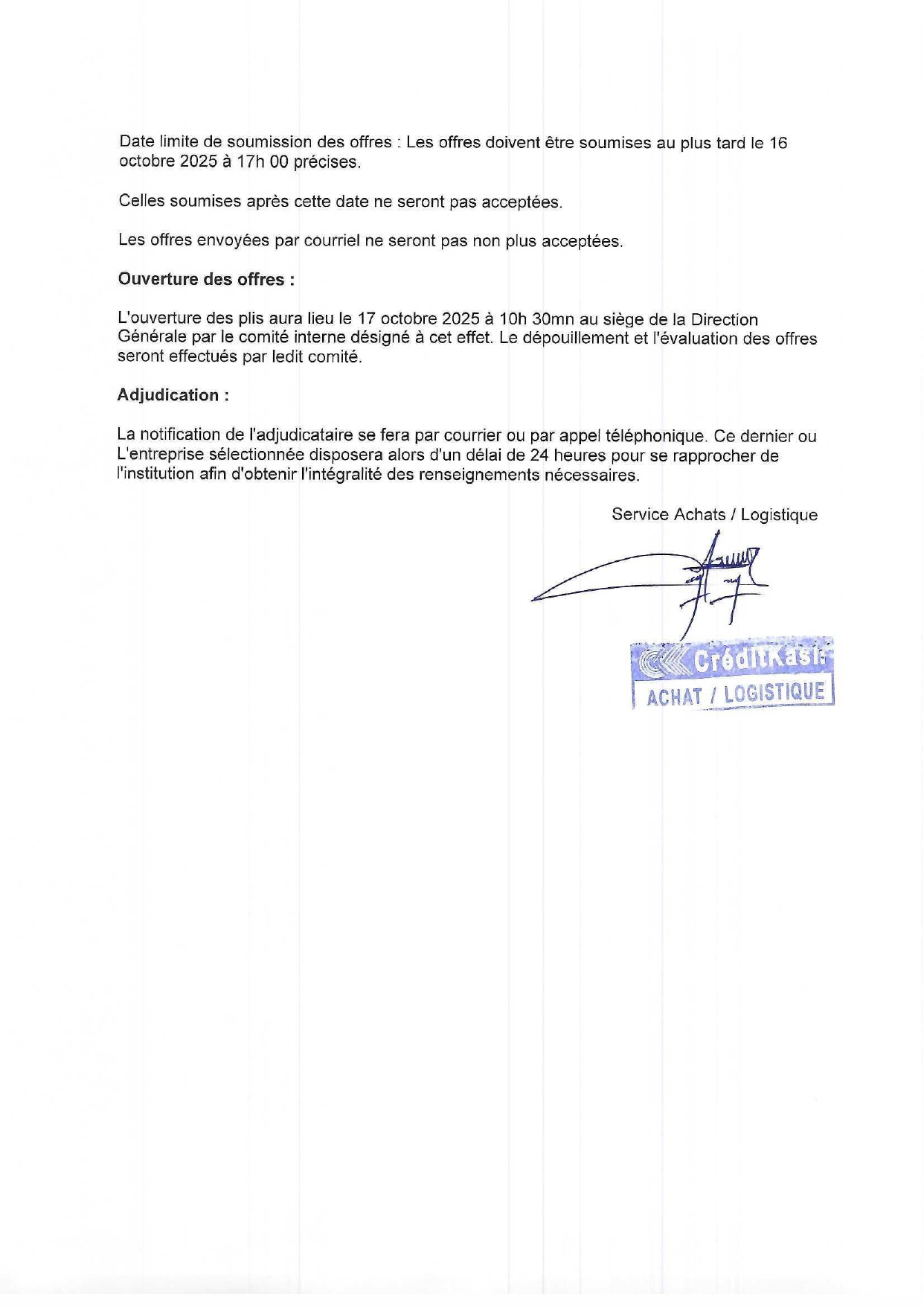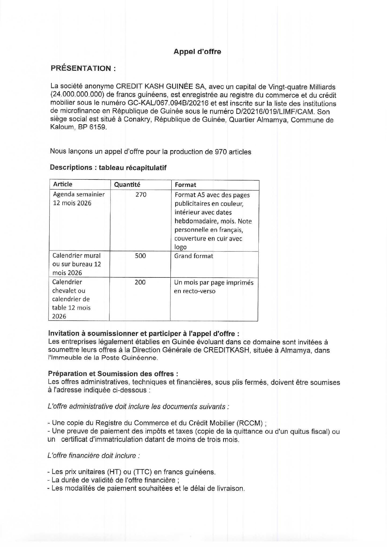 > Avis d'appel d'offres pour la production de 970 articles de papeterie