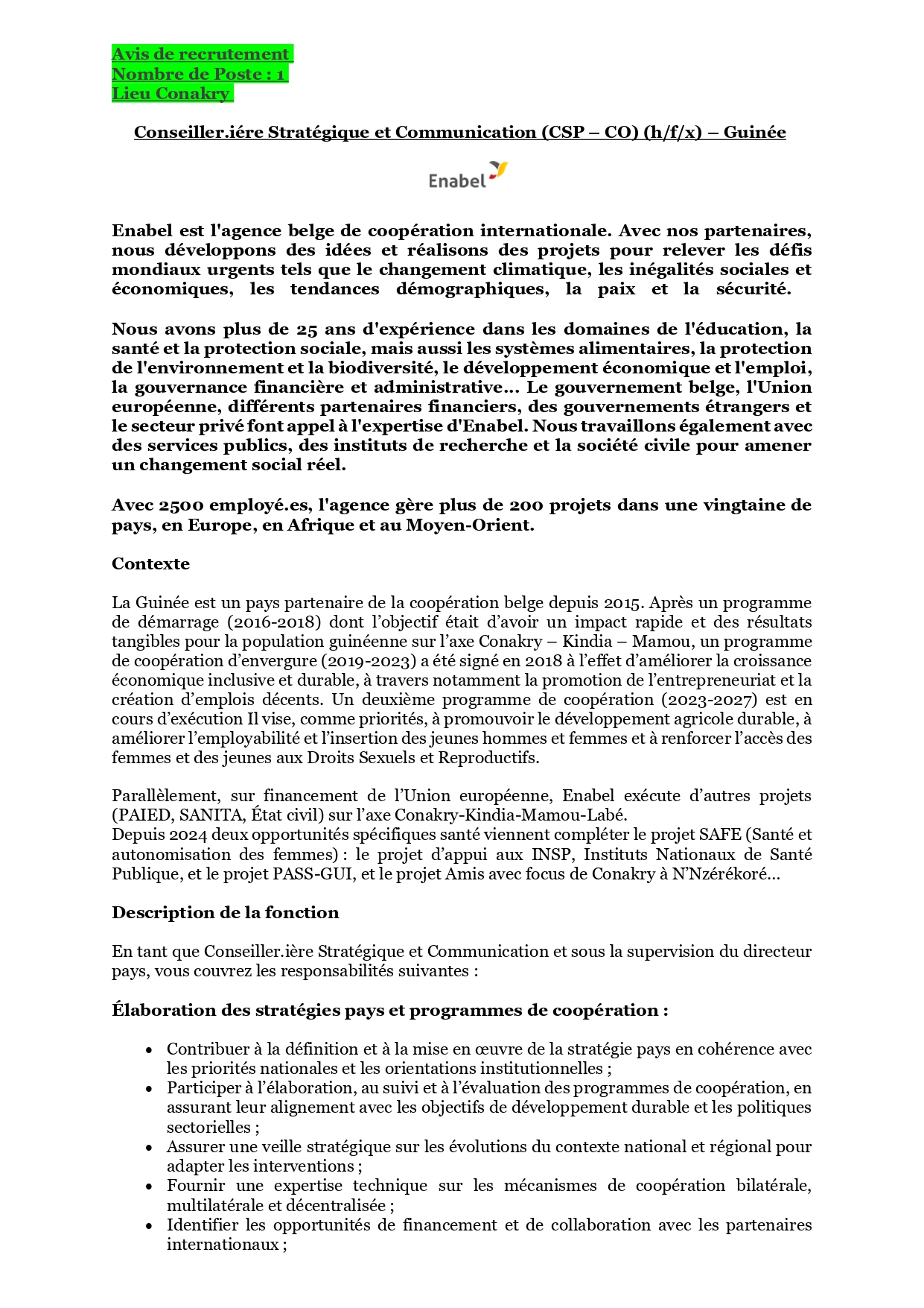 (CSP – CO) (enabel.be) seront prises en considération et seul (s)