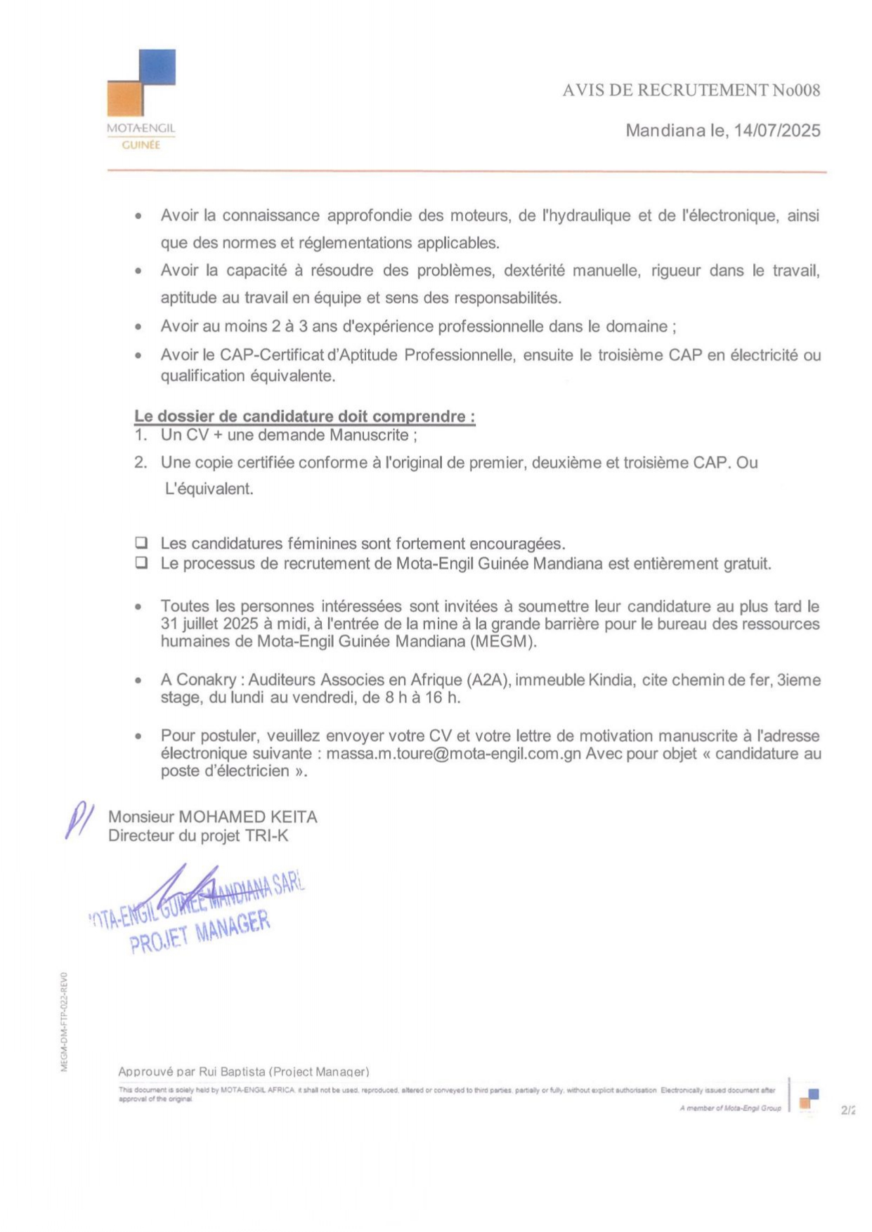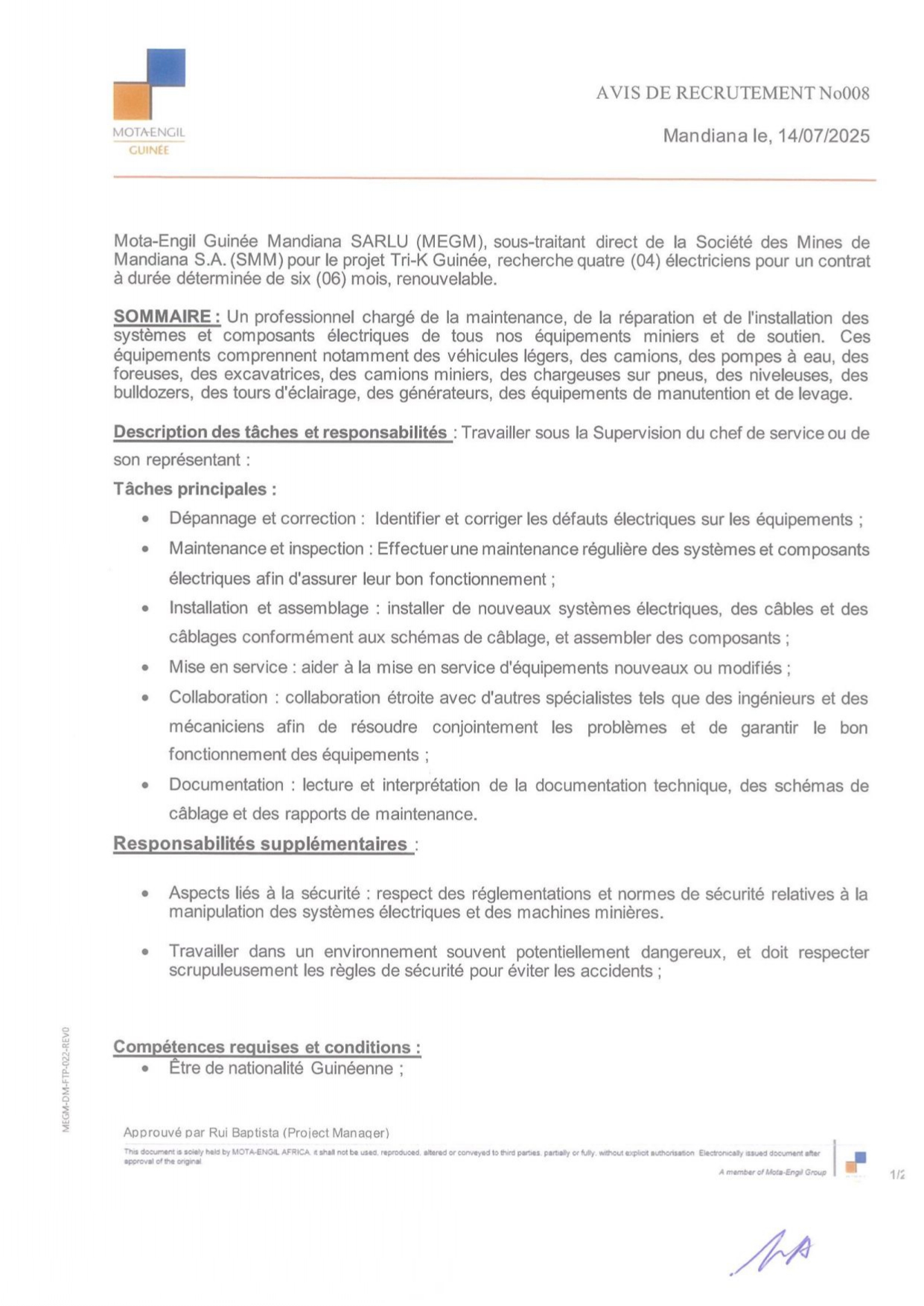 > Avis de recrutement de quatre (04) électriciens pour un contrat à durée déterminée de six (06) mois