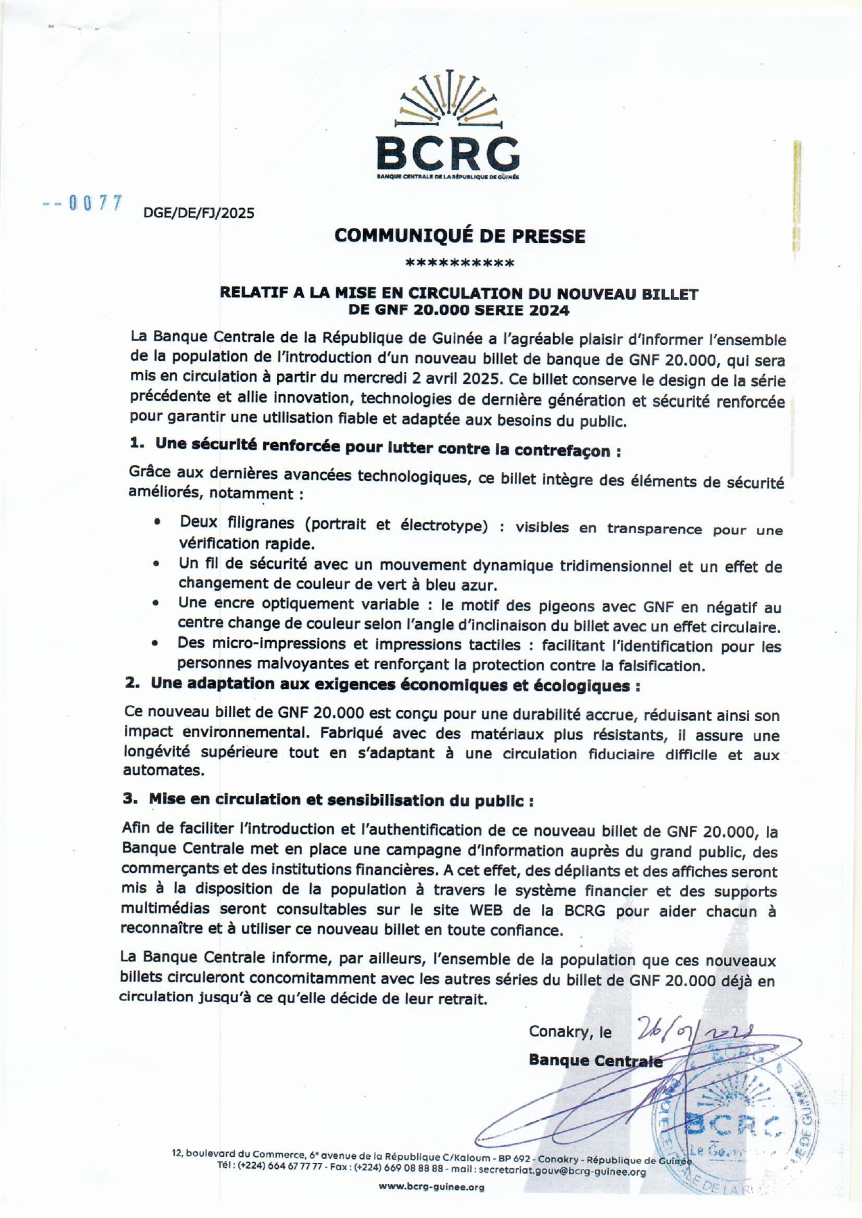 > COMMUNIQUÉ DE PRESSE RELATIF A LA MISE EN CIRCULATION DU NOUVEAU BILLET DE GNF 20.000 SERIE 2024