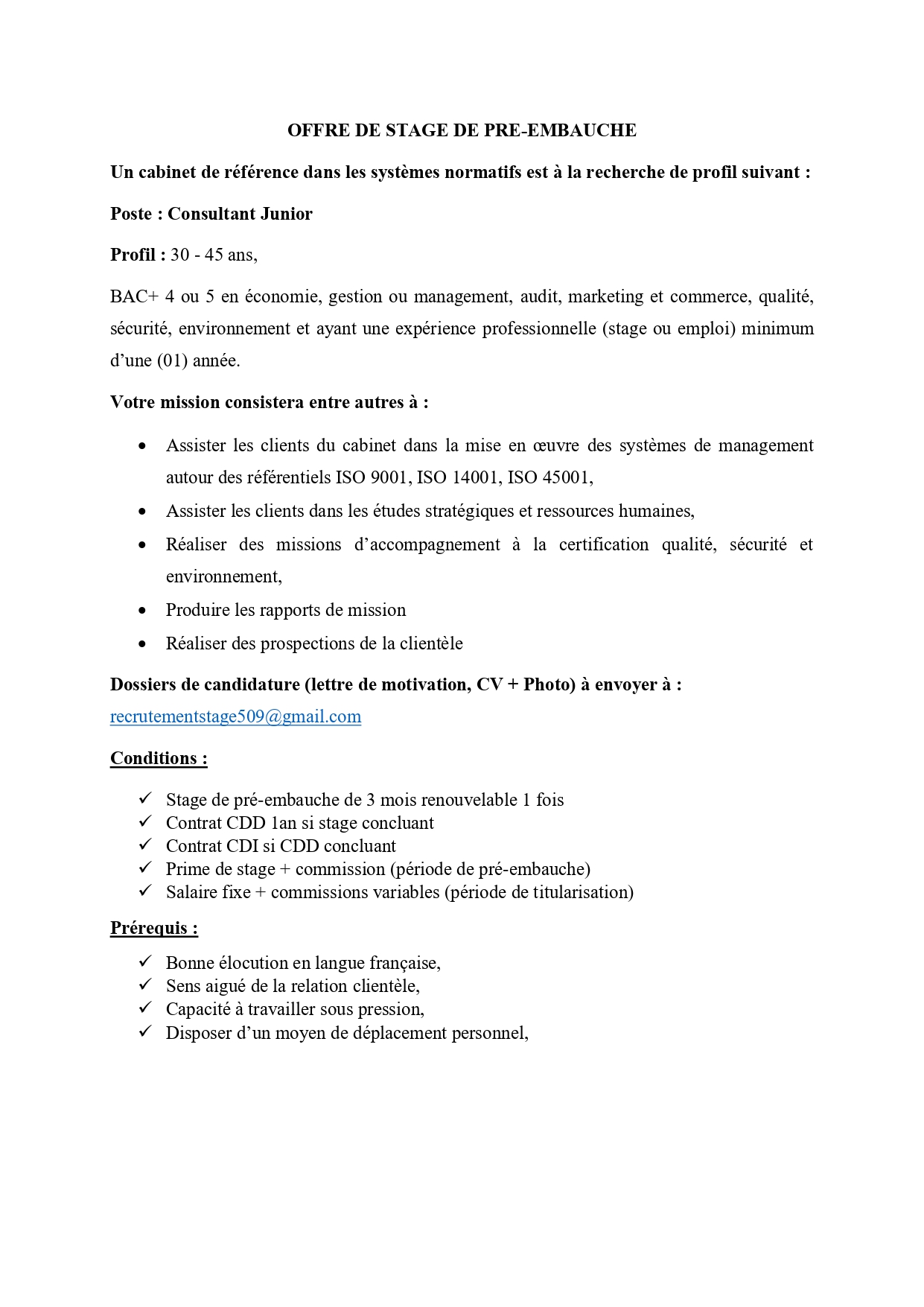 > OFFRE DE STAGE DE PRE-EMBAUCHE: Consultant Junior
