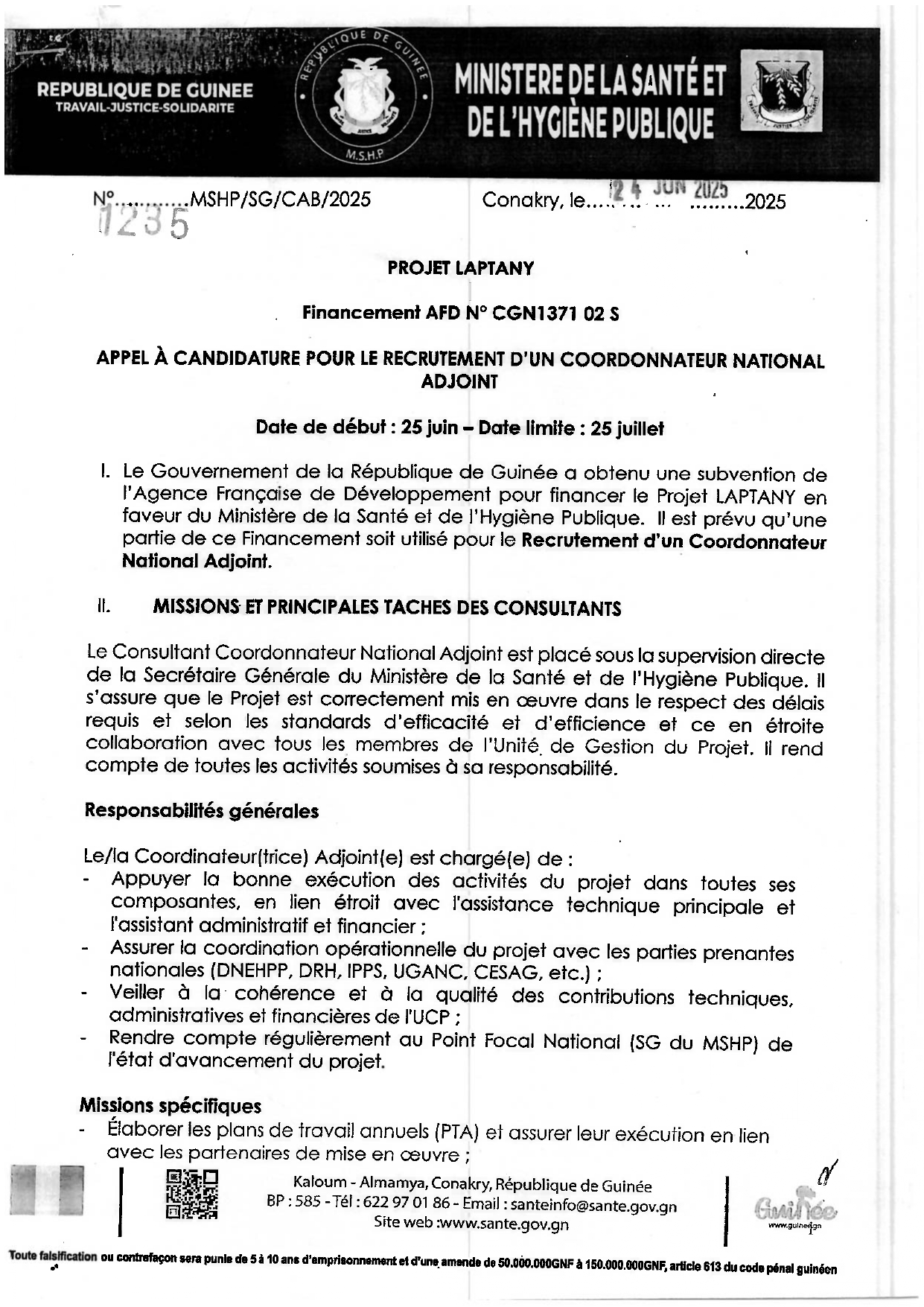 > APPEL À CANDIDATURE POUR LE RECRUTEMENT D'UN COORDONNATEUR NATIONAL ADJOINT