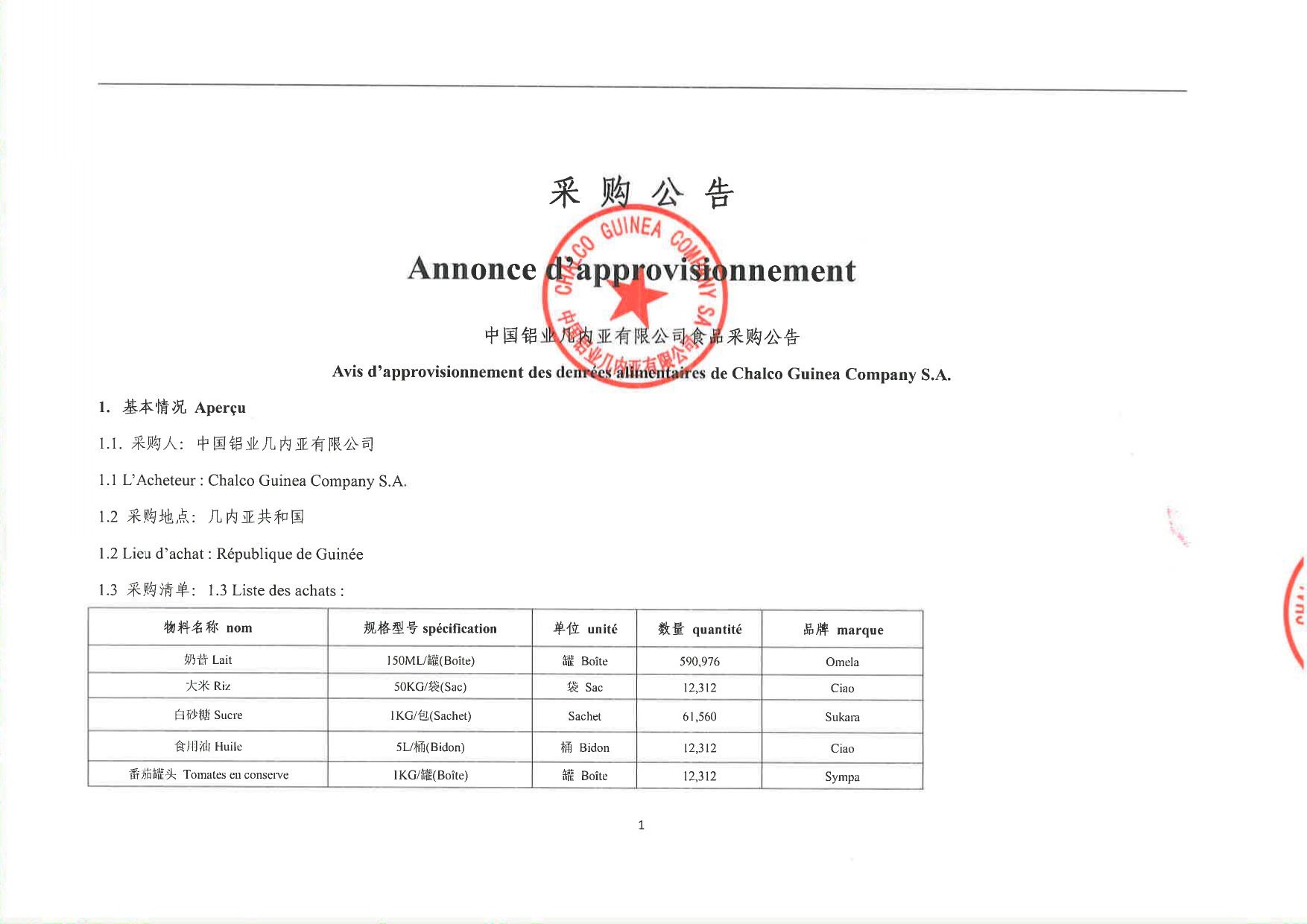 > Avis d'approvisionnement des denrées alimentaires de Chalco Guinea Company SA
