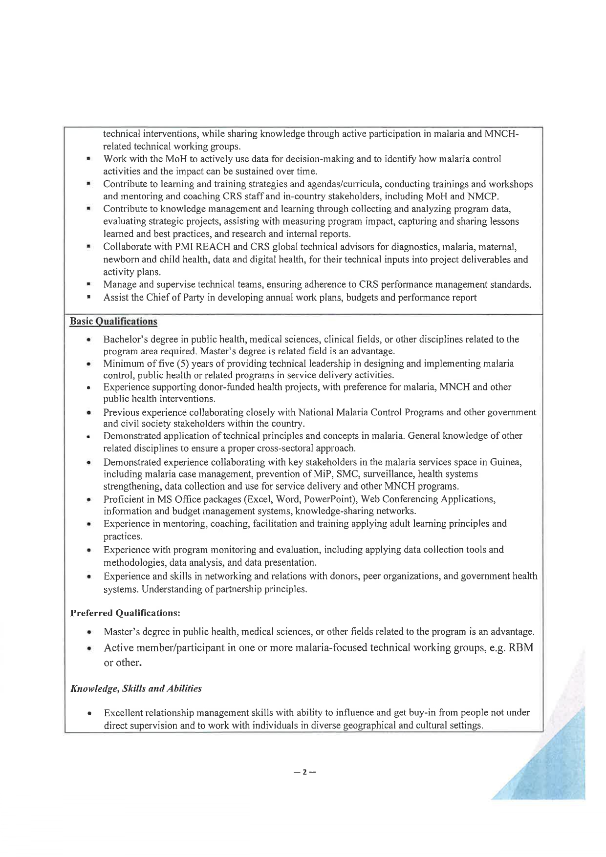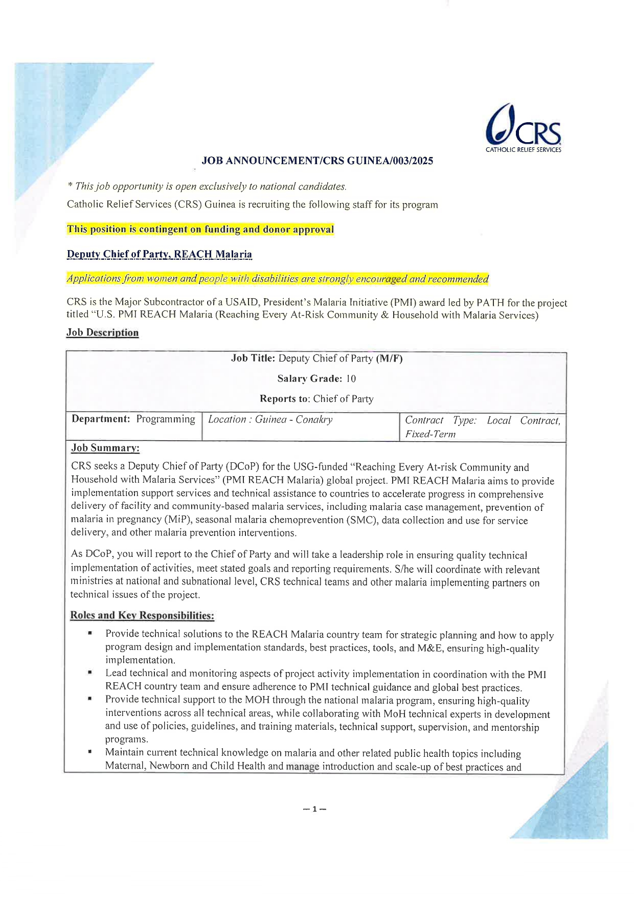> Avis de recrutement d'un Deputy Chief of Party, REACH Malaria