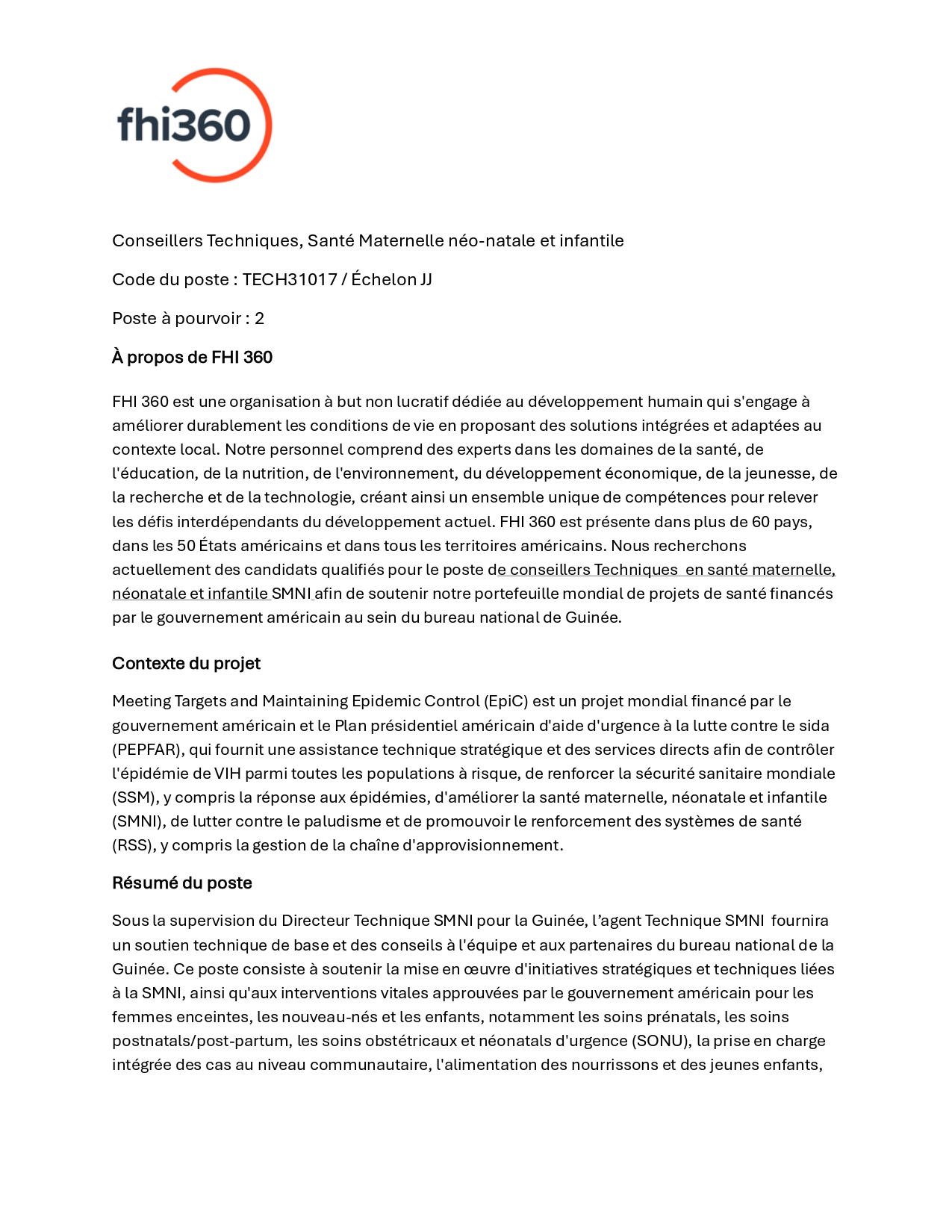 > Avis de recrutement de Conseillers Techniques, Santé Maternelle néo-natale et infantile